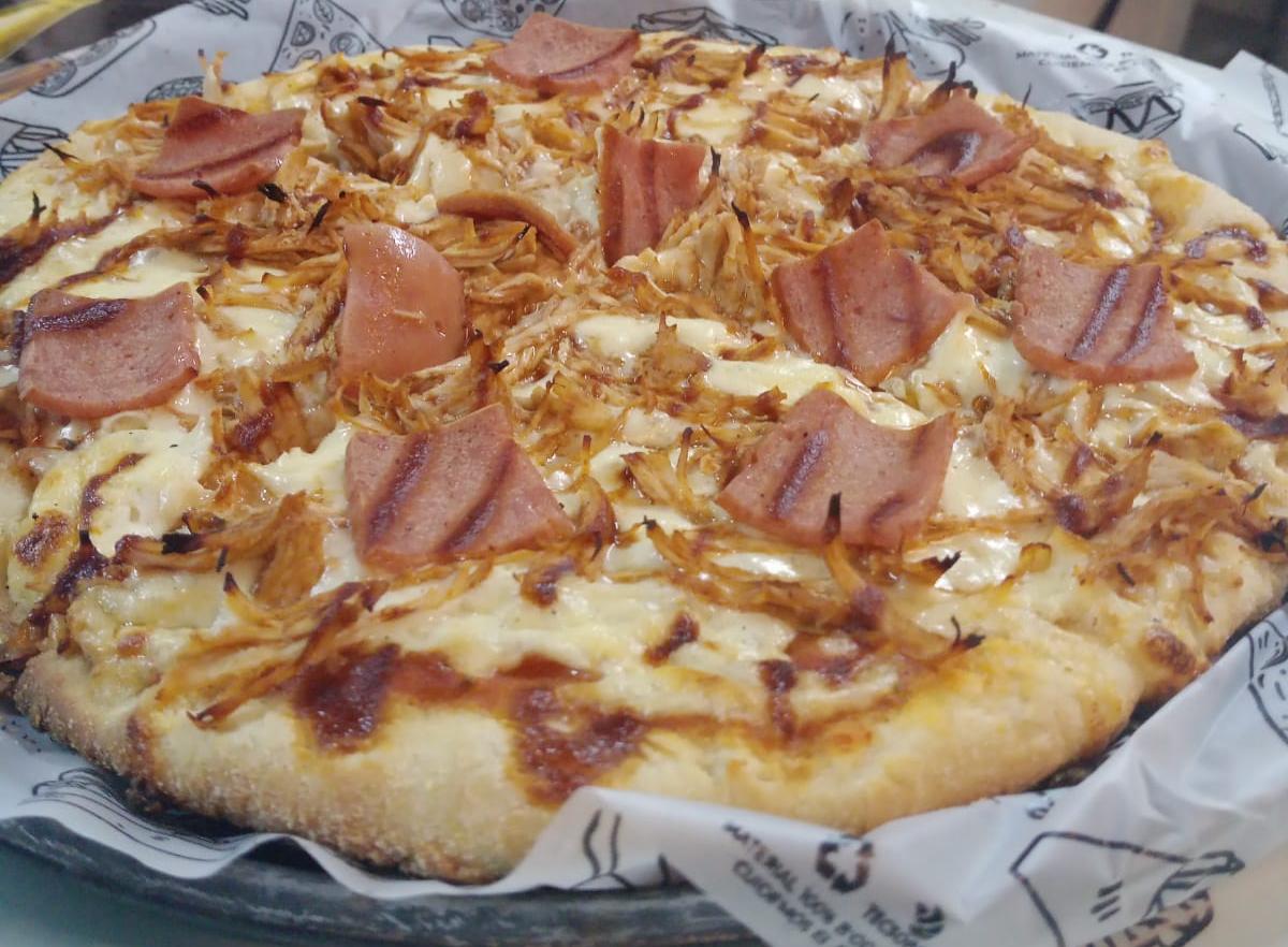8 Porciones. Masa artesanal, salsa napolitana, queso mozzarella, pollo en salsa BBQ, tocineta.