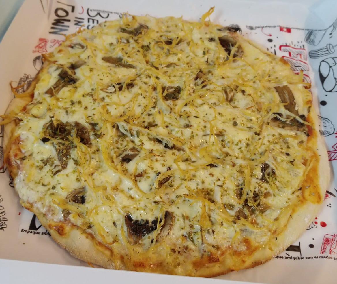 4 Porciones. Masa artesanal, salsa napolitana, queso mozzarella, pollo, champiñón.