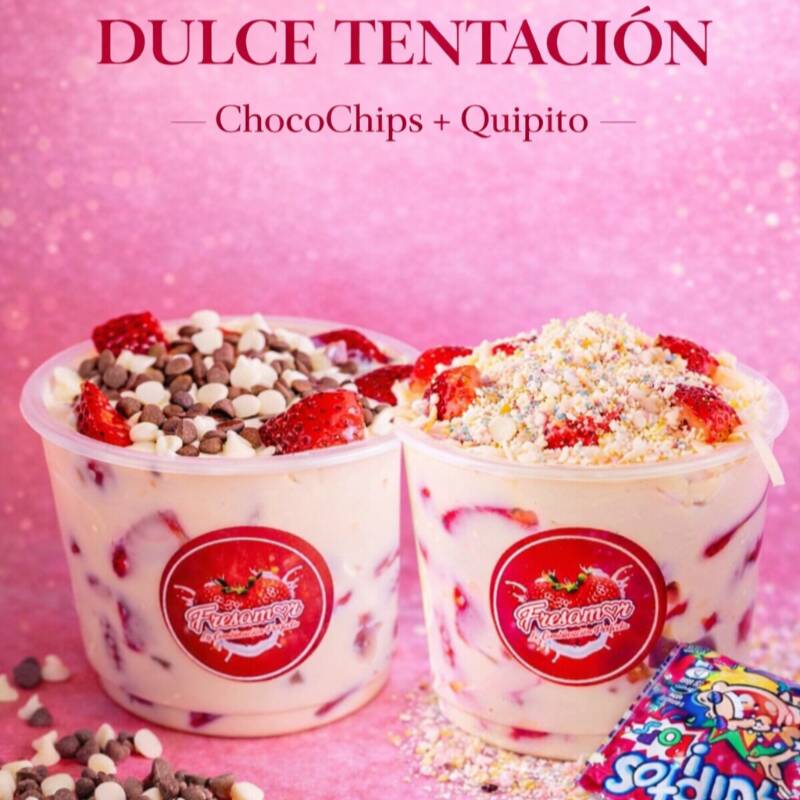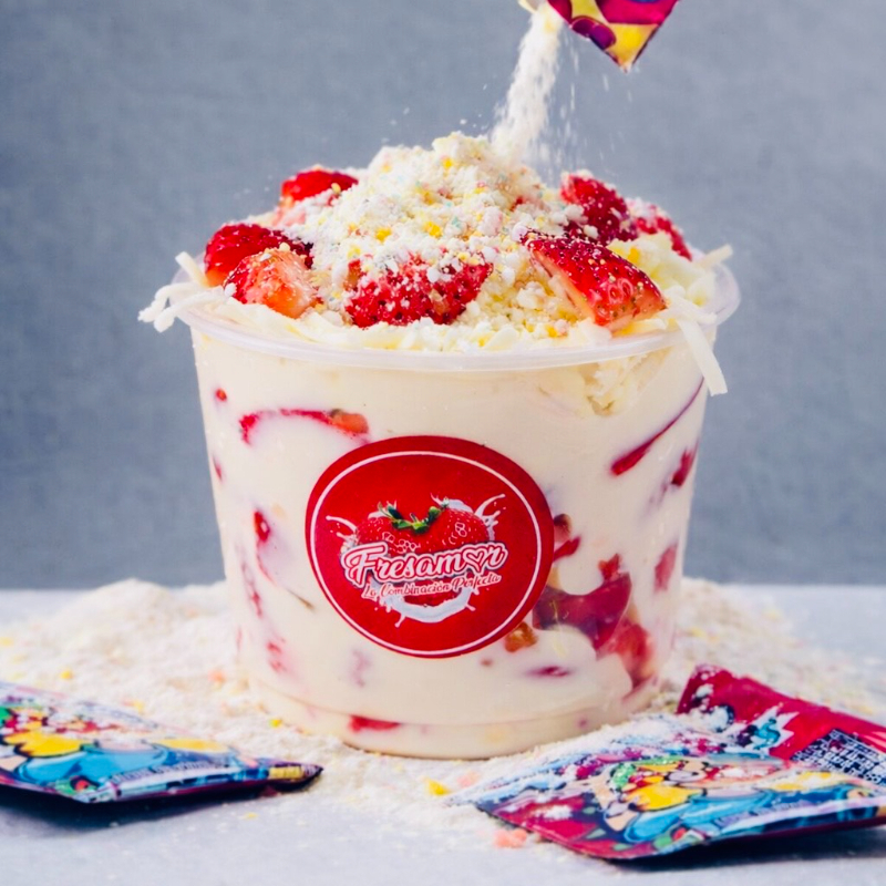 16Oz Fresas frescas, crema suave, queso y un baño explosivo de quipito que cae como lluvia de sabor. crocante dulce y adictivamente delicioso. siente la explosion de amor de fresamor