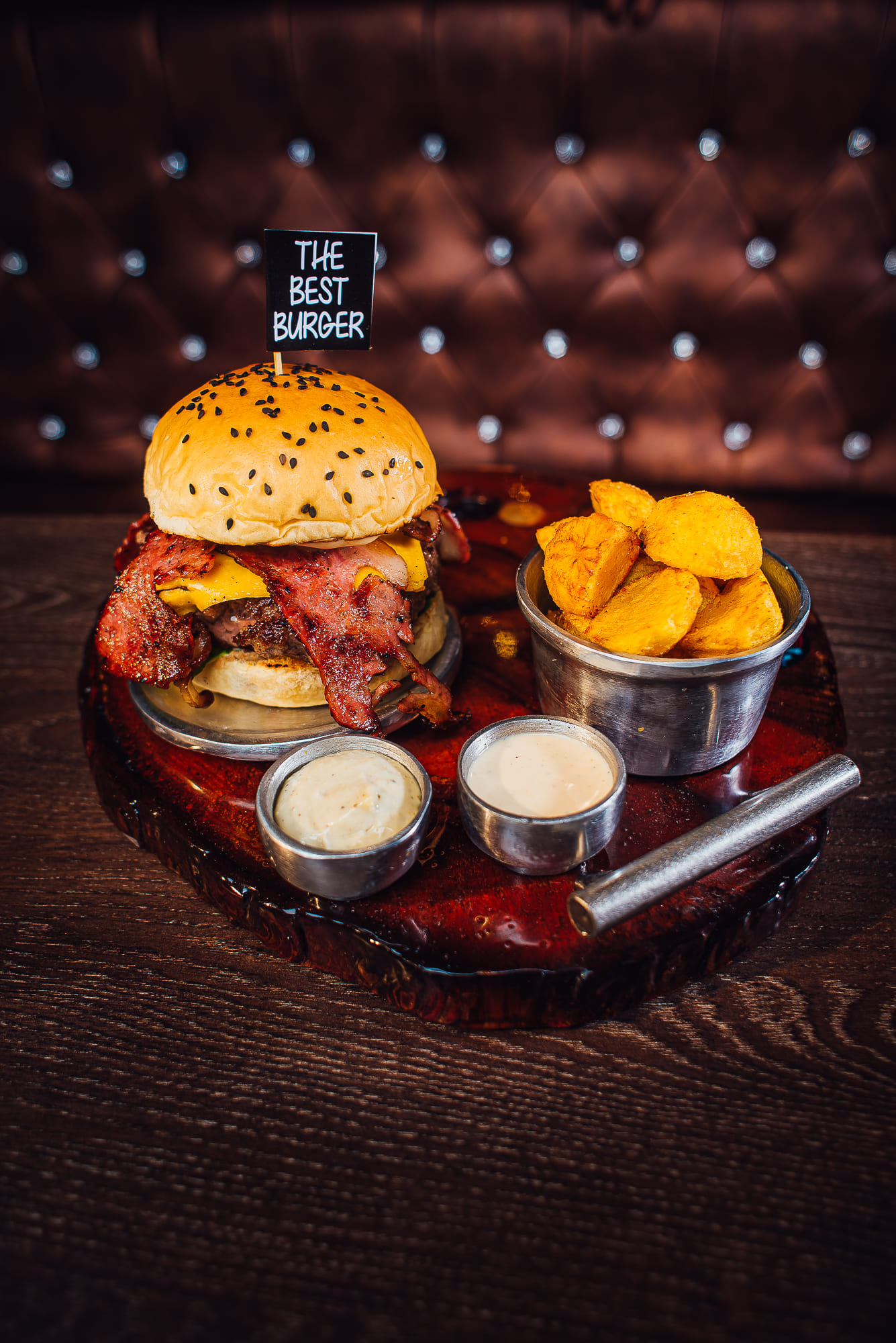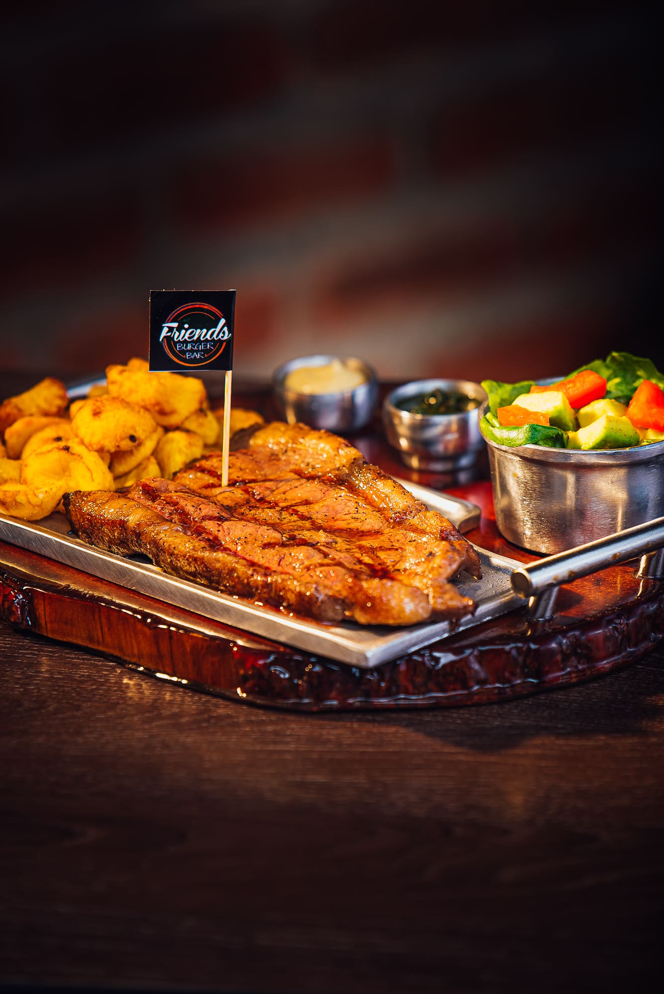 Carne angus x200gr, pan, salsa de la casa, lechuga, tomate, tocineta, maduro guayabo. Bañada en queso parmesano; acompañada por salsa de ajo y salsa chipotle