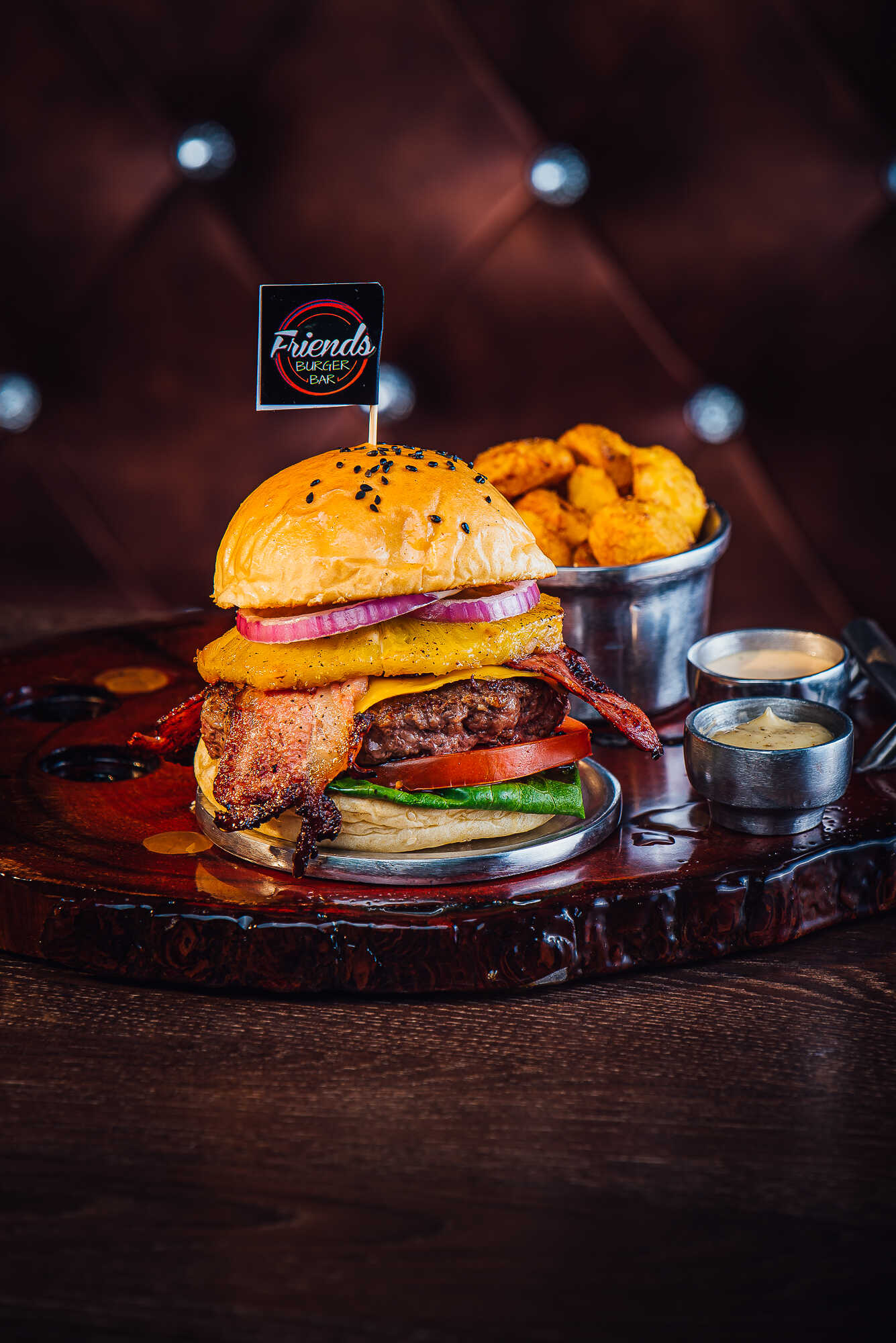 Carne angus x200gr, pan, salsa de la casa, lechuga, queso americano, tocineta, guacamole de la casa, nachos y pico de gallo. Acompañada con salsa de ajo y salsa chipotle