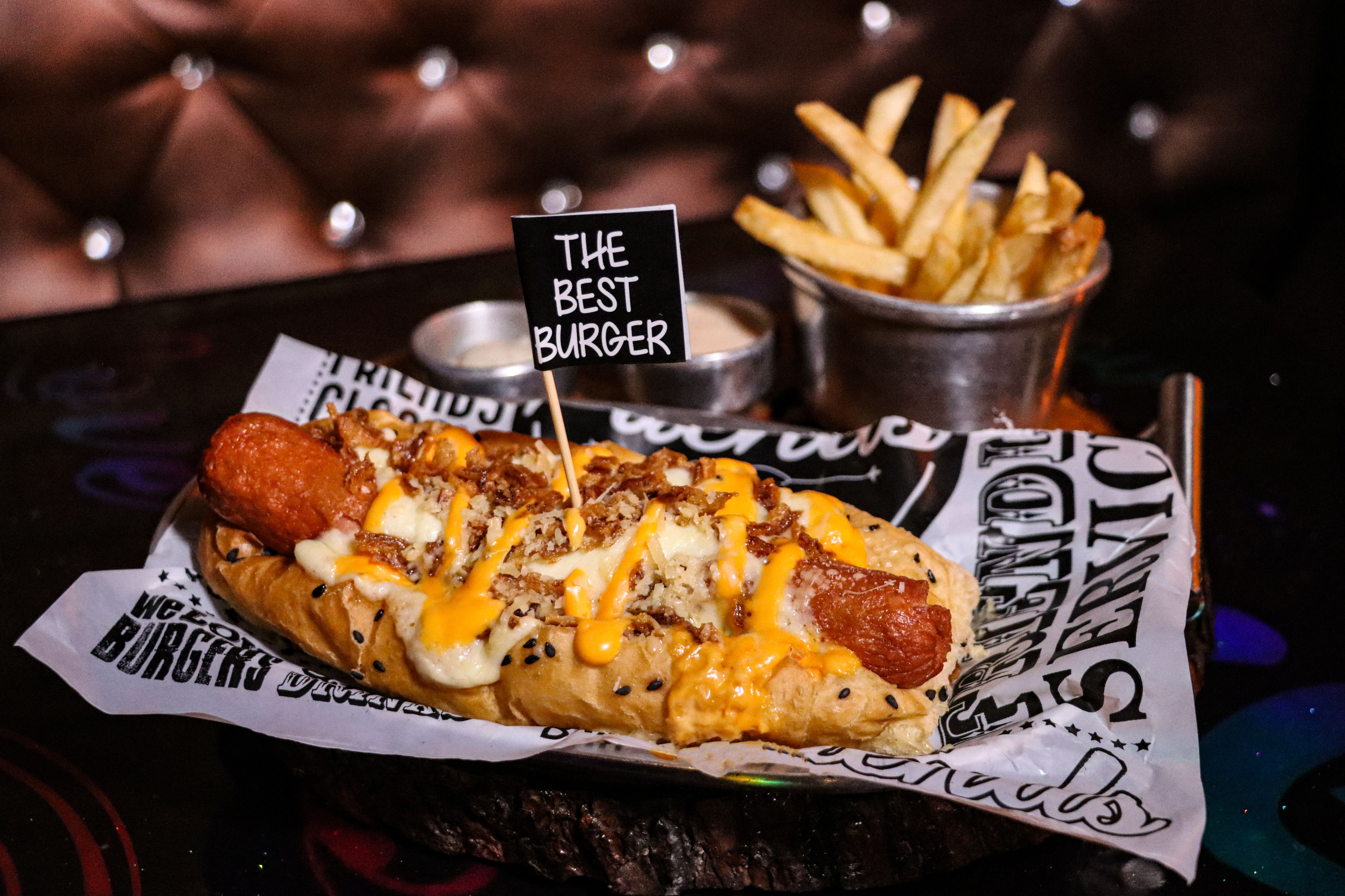 Salchicha parrillera premium, pan perro relleno de tocineta, queso mozzarella, cebolla crocante, salsa de queso.