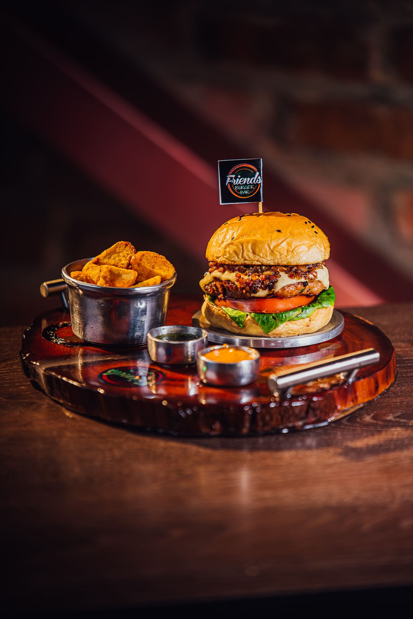 Carne angus x200gr, pan, salsa de la casa, lechuga, tomate, cebolla cruda crocante. Acompañada con salsa de ajo + papa criolla