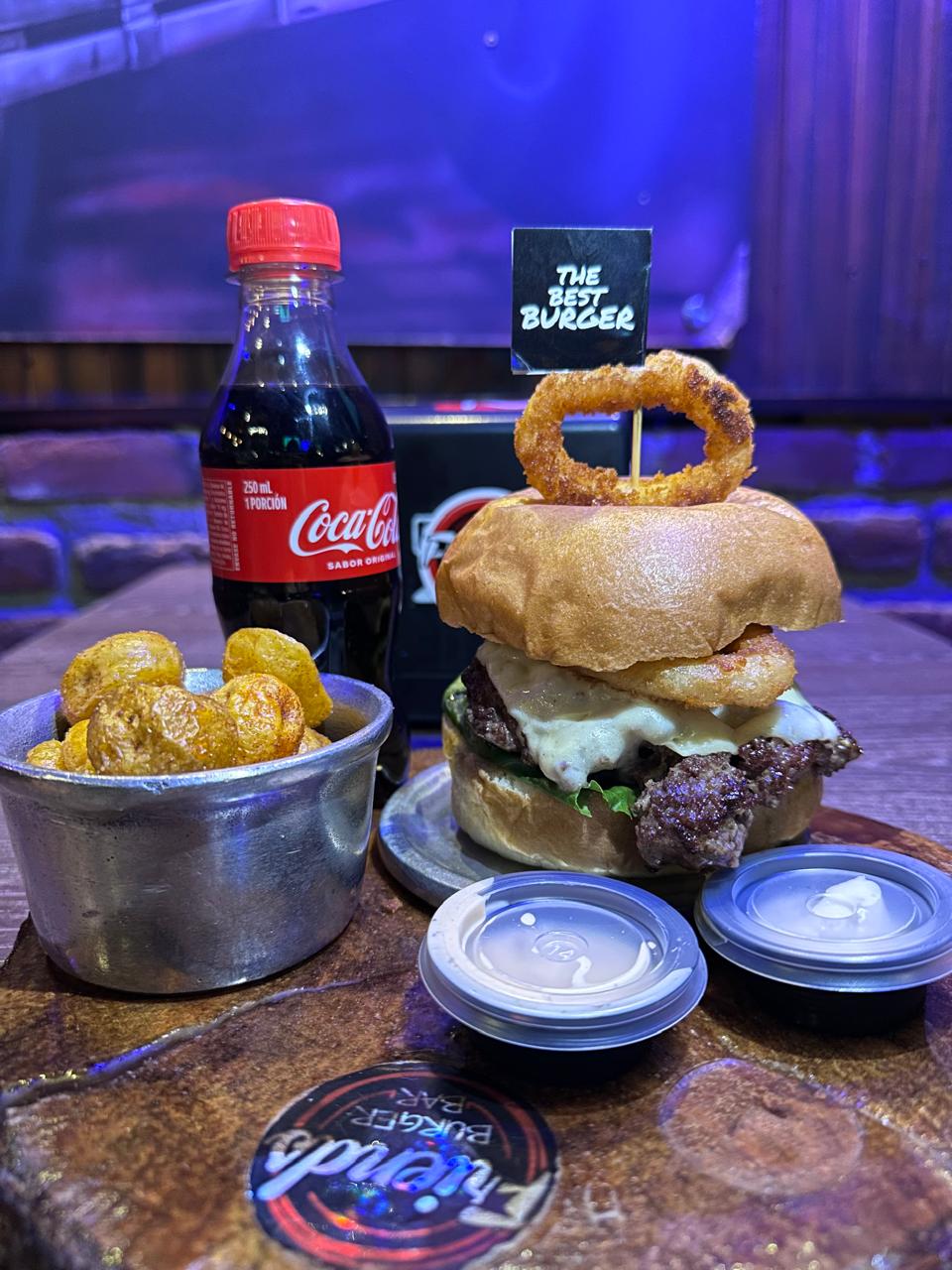Carne angus x200gr, pan, salsa de la casa, lechuga, queso americano, tocineta, guacamole de la casa, nachos y pico de gallo. Acompañada con salsa de ajo y de la casa + papas criollas + coca cola 250ml
