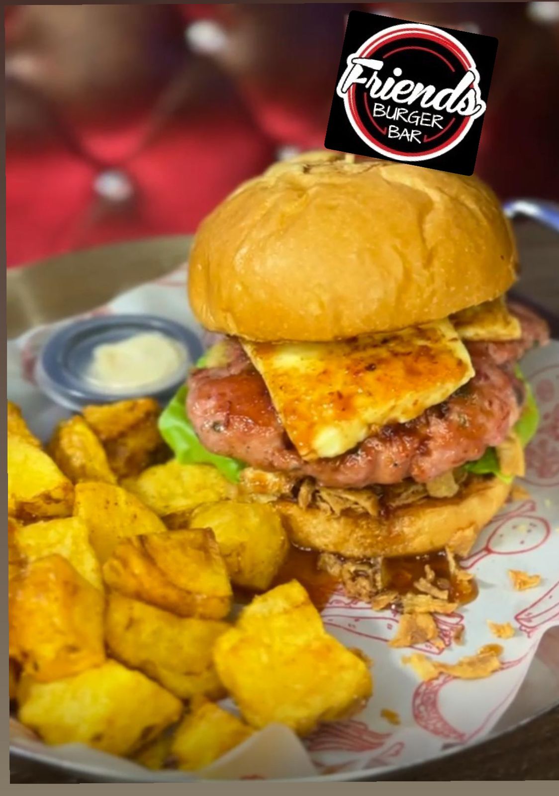 Mezcla de 200 g de carne Angus y santo chorizo, pan , salsa de la casa, lechuga, tomate, queso mozzarella, cebolla frita, acompañada de chimichurri + papas criolla