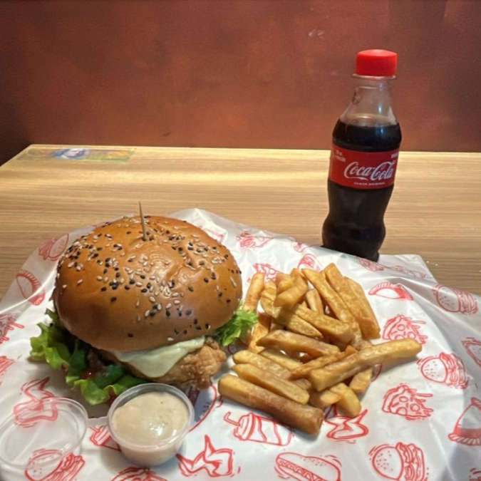 Carne Angus x 200 g, pan, salsa de la casa, lechuga, queso americano, tocineta, guacamole de la casa, nachos, pico de gallo, acompañada de salsa de ajo y salsa chipotle + papa criolla + coca cola 250ml