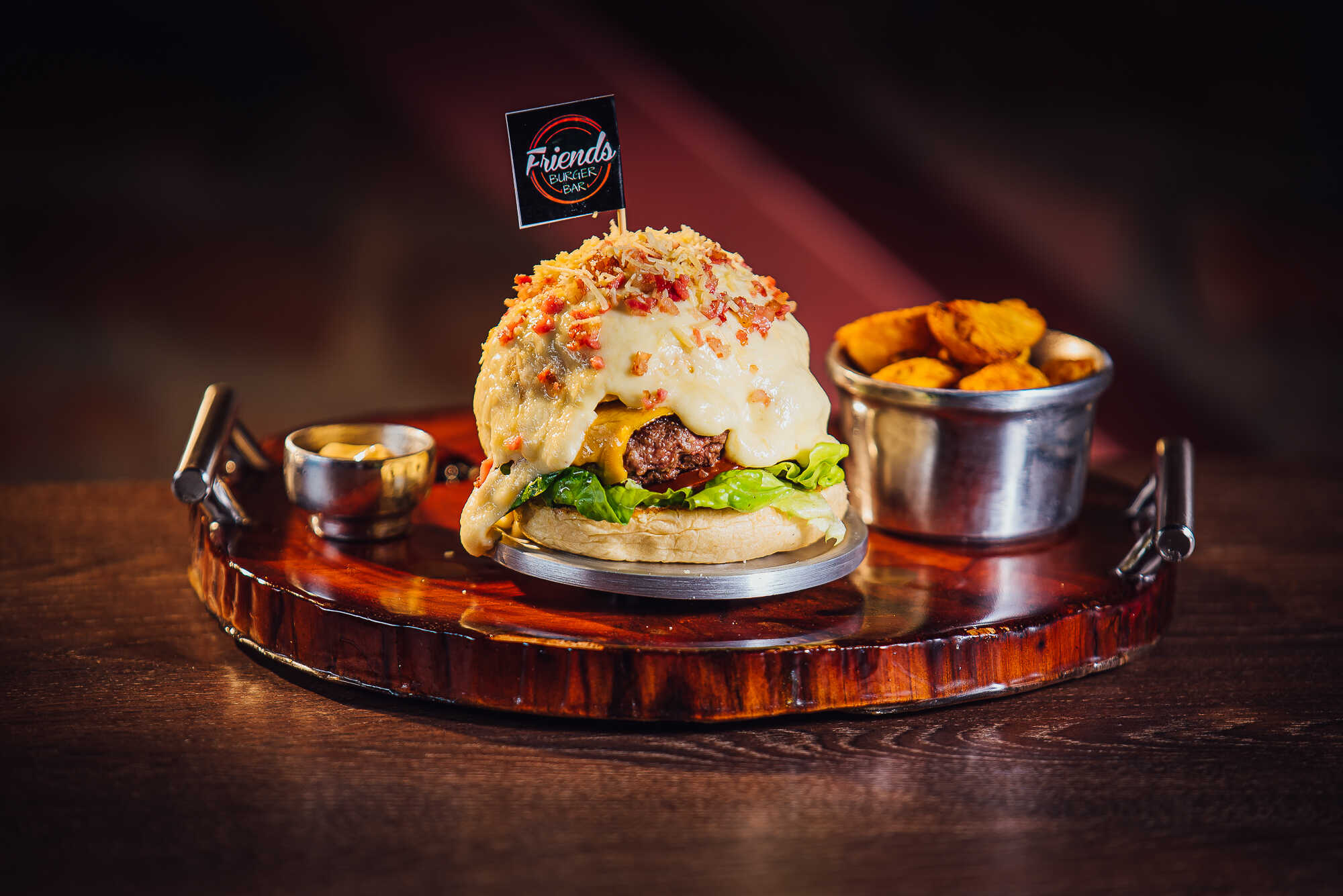 Carne Angus x 125g, pan, salsa de la casa, lechuga, tomate, bañada en queso mozzarella y trozos de tocineta, queso parmesano.