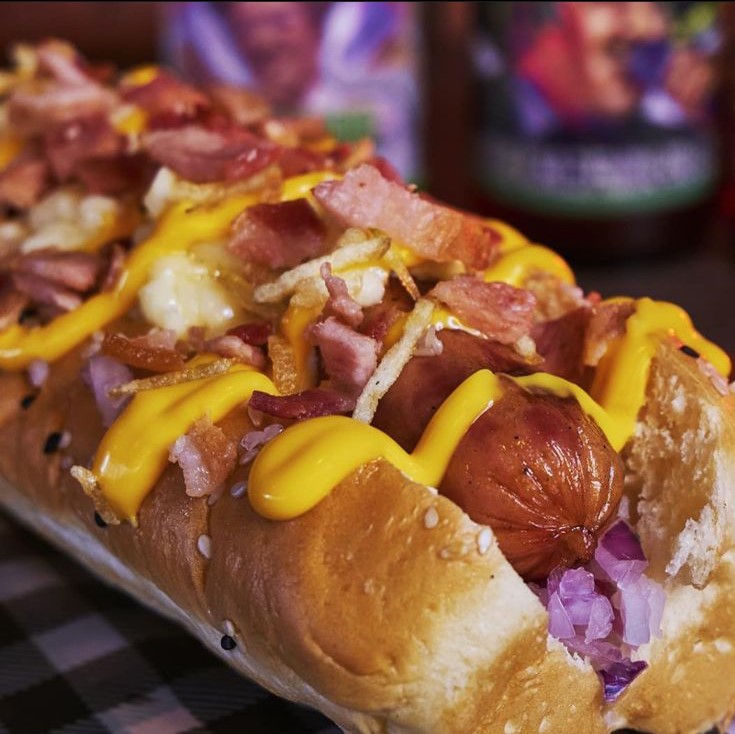 Salchicha ranchera, pan perro relleno de tocineta, queso mozzarella, cebolla crocante, salsa de queso + bebida