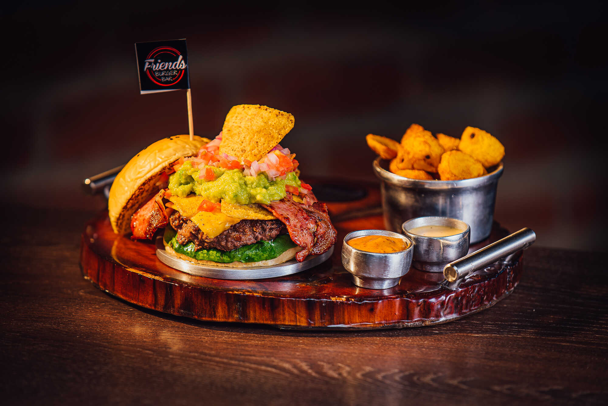 Carne Angus x 180 g, pan, salsa de la casa, lechuga, queso americano, tocineta, guacamole de la casa, nachos, pico de gallo, acompañada de salsa de ajo y salsa chipotle + papa criolla + gaseosa mini postobon segun disposición