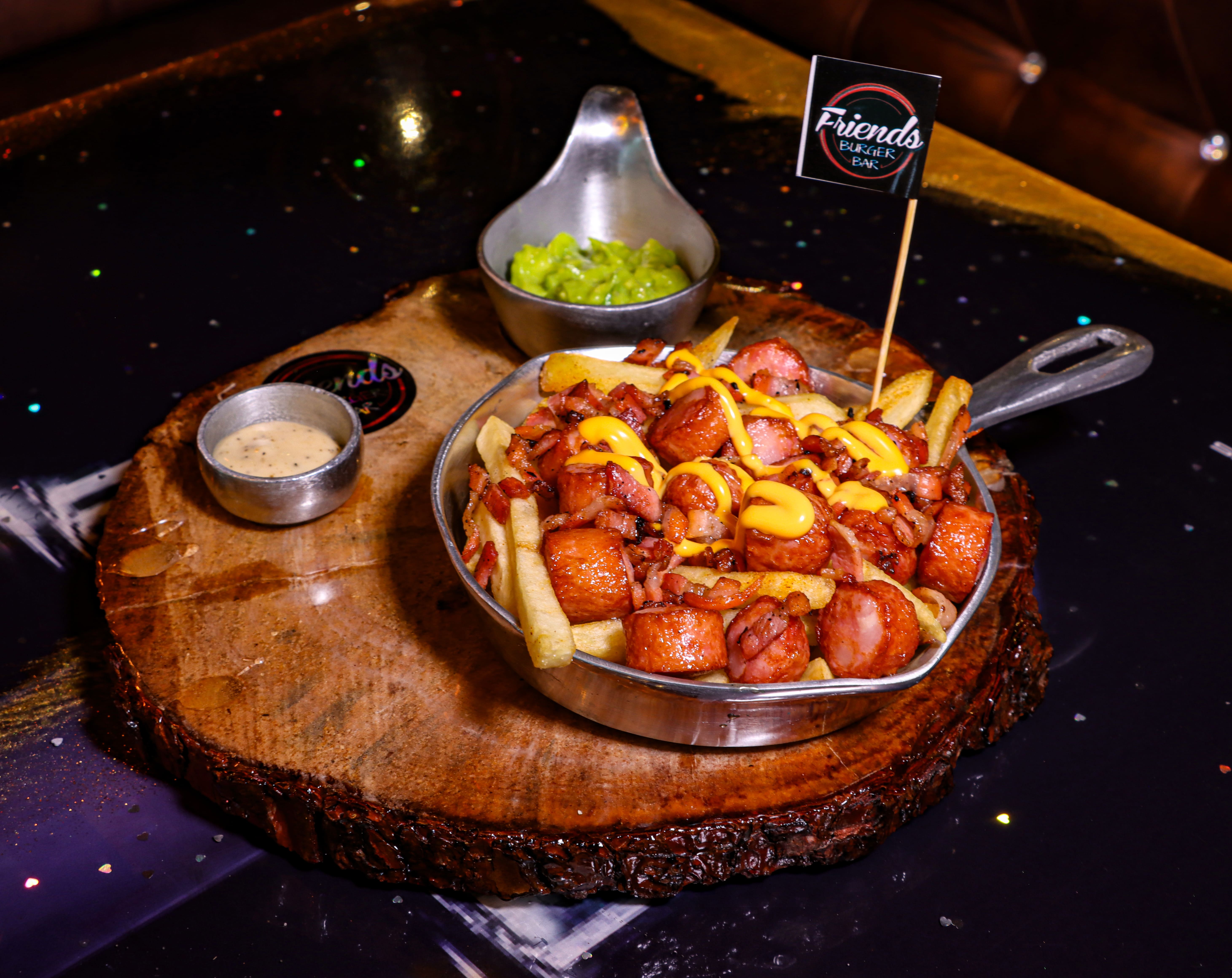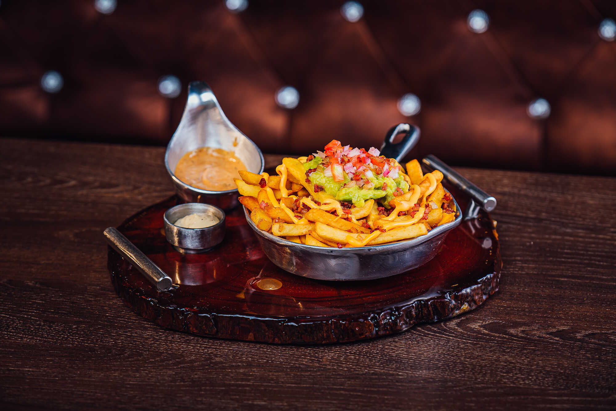 Sarten de tocineta, papas francesas, guacamole, queso mozzarella y salsa de la casa