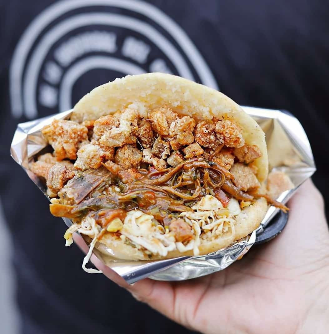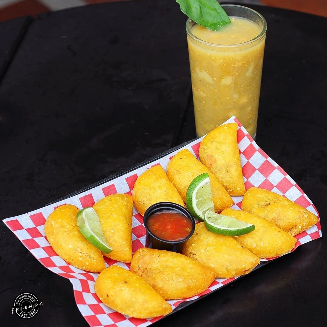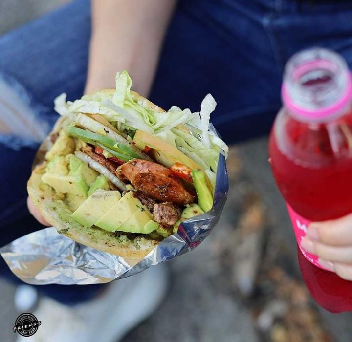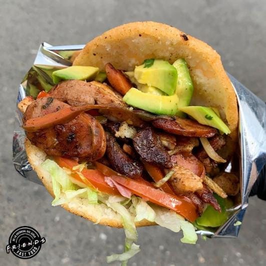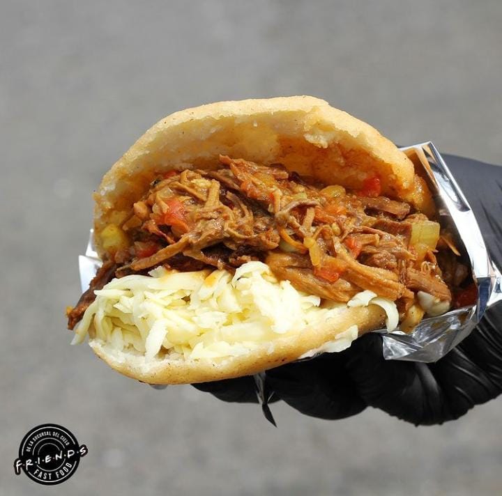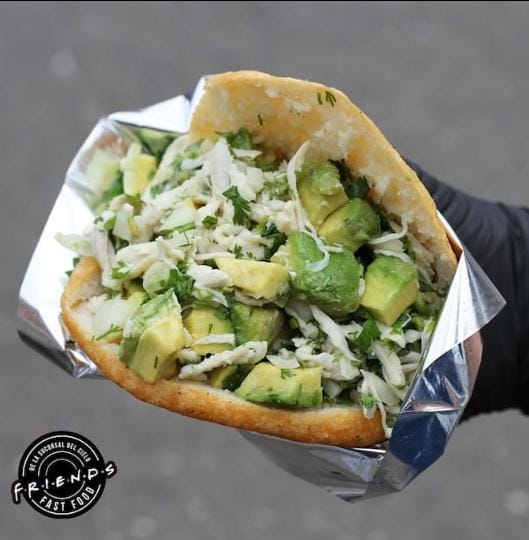 Arepa de maíz rellena de pollo desmechado, aguacate, cilantro, cebolla y salsa Friends
