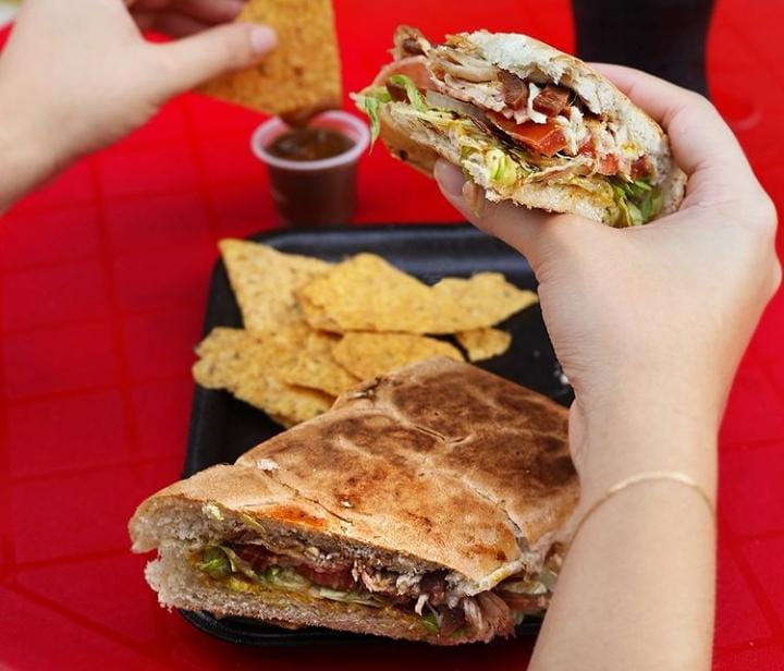 pan artesanal, pollo desmechado, lechuga, tomate , cebolla, pimenton, salsa friends acompañado de nachos