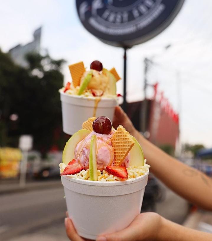 Variedad de frutas tropicales, crema tipo chantilly,queso doble crema, galletas, 2 bolas de helado y leche condensada.