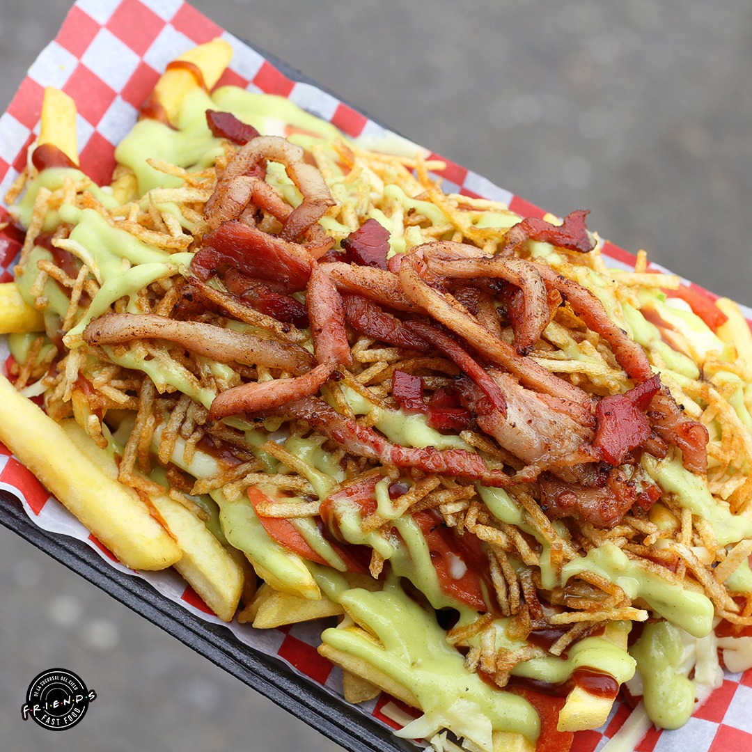 Papa a la francesa, salchicha, tocineta, queso gratinado, ripio de papa, pechuga de pollo, carne punta de anca, chicharrón, chorizo de cerdo, empanada y variedad de salsas