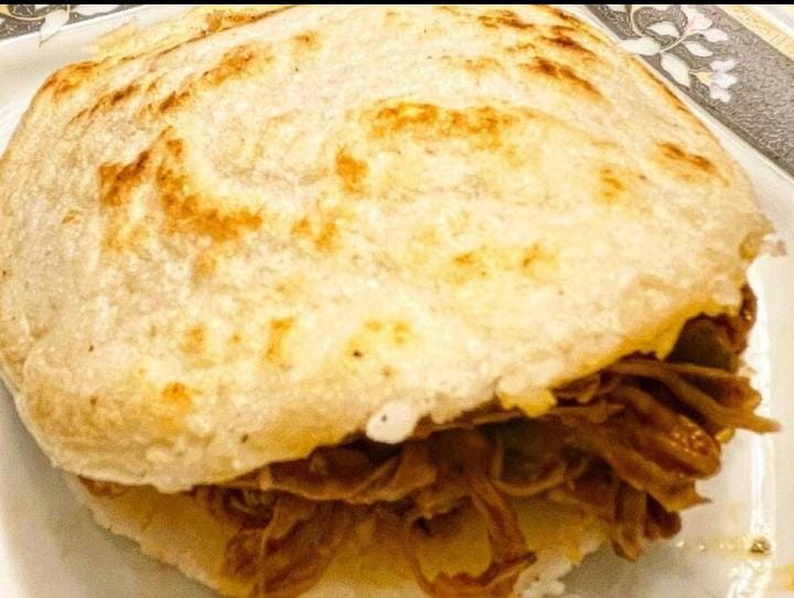 Arepa de maíz tierno acompañada de carne desmechada en salsa hogao y queso fundido mozzarella.