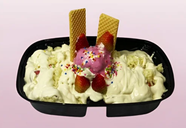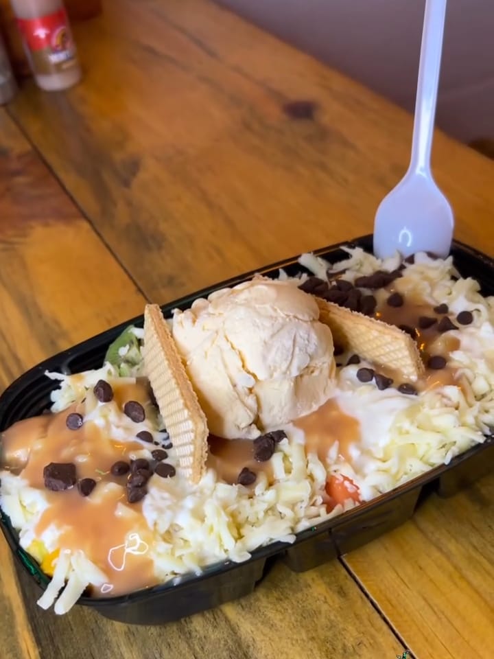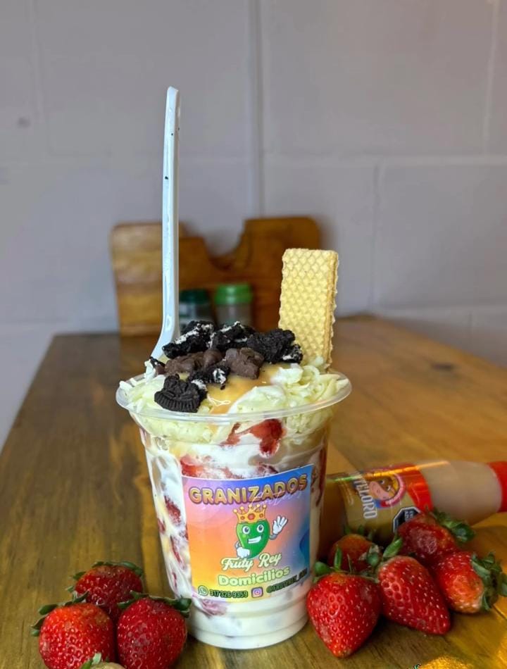 Fresas, crema de leche, 1 bola de helado de vainilla, waffer, queso rallado, 1 Oreo y chips de chocolate.
