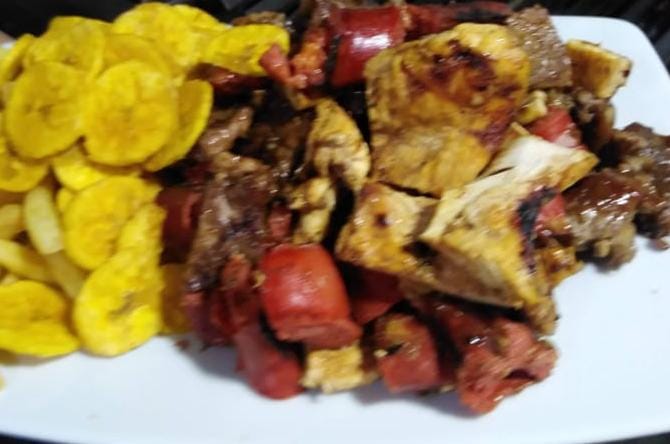 Res, pollo, costilla ahumada, chorizo, porción de papa, ensalada de maicitos.