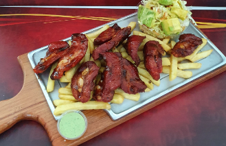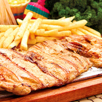200 gr de pollo, porción de papa a la francesa, ensalada de maicitos.