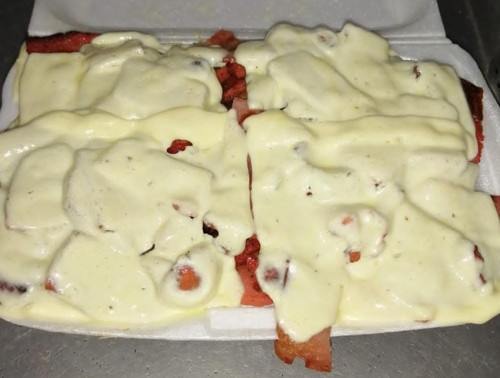 Guiso de cebolla, salchicha ideal, jamón, queso, salsa de tomate, rosada, casera, ripio y tocineta.
