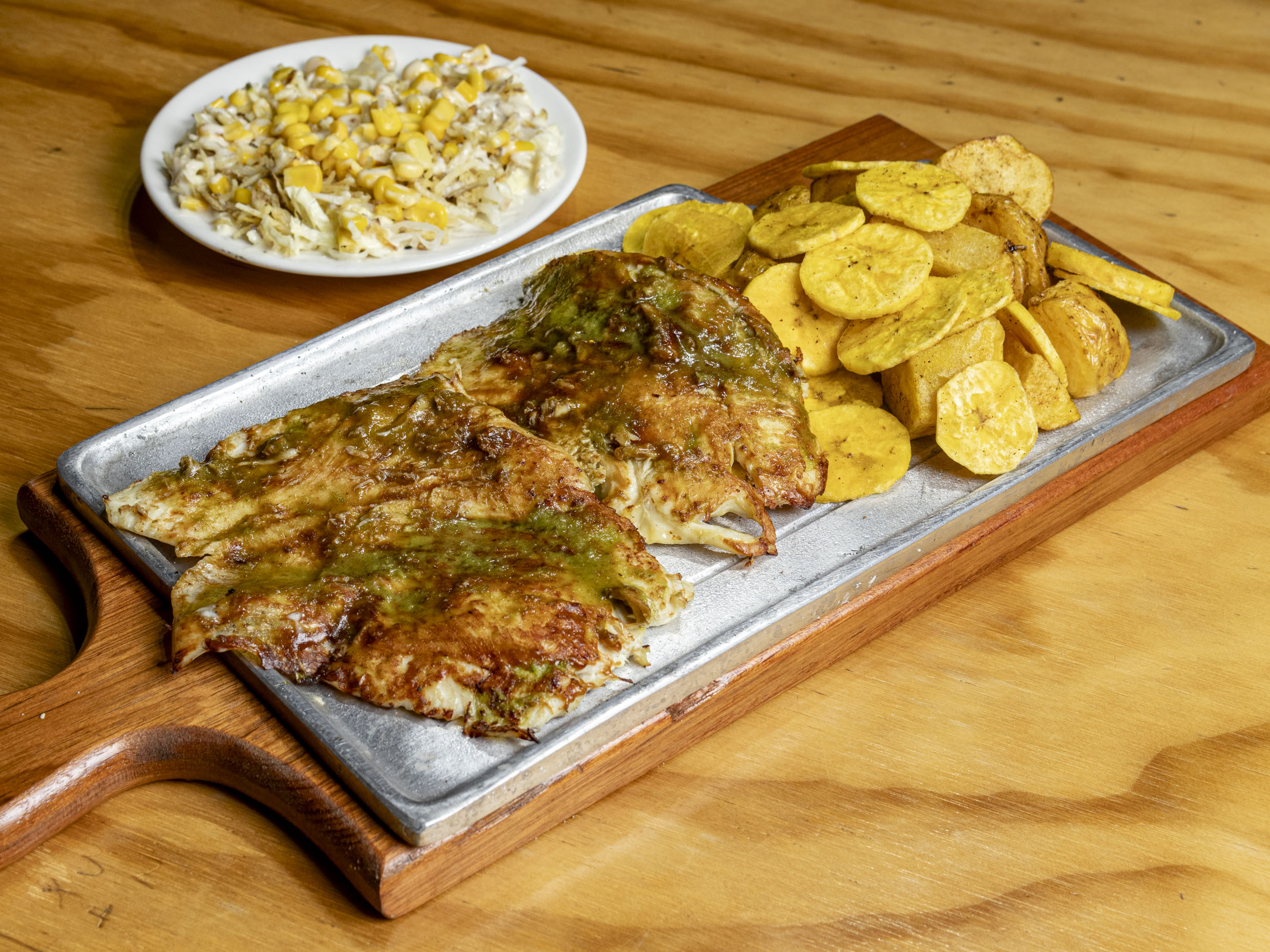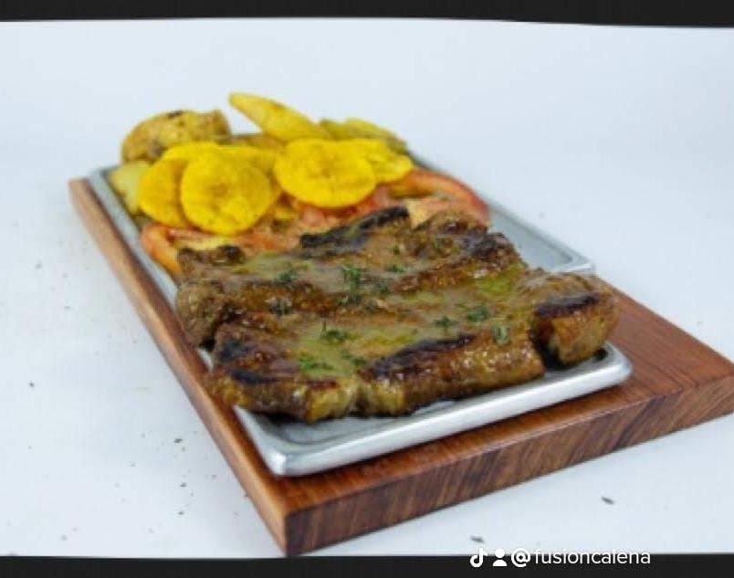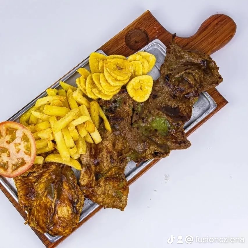 Res, pollo, costilla ahumada, chorizo, porción de papa, ensalada de maicitos .