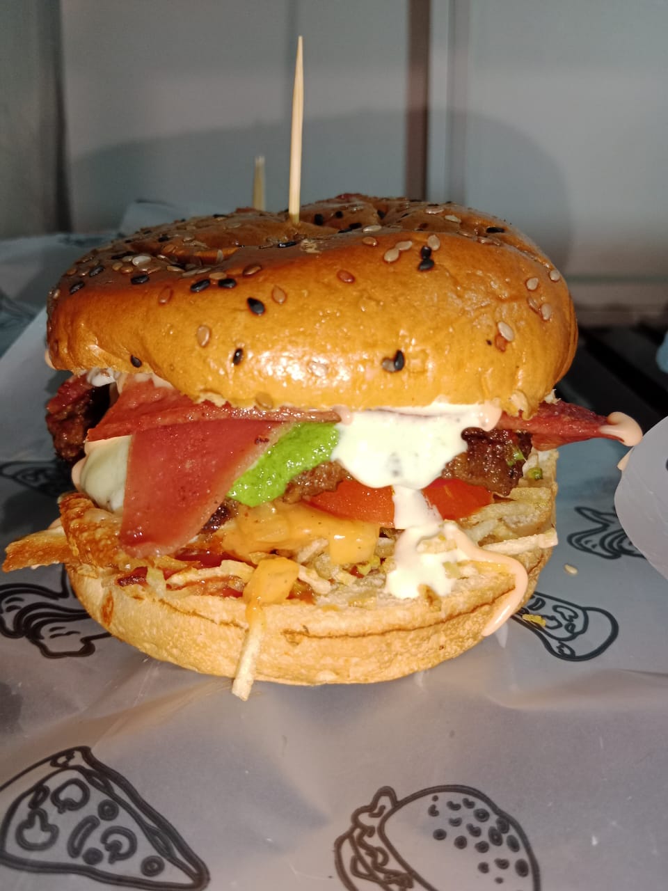 Viene con lechuga, ripio, maicitos,, salsa de la casa, tocineta, carne de res y pollo.