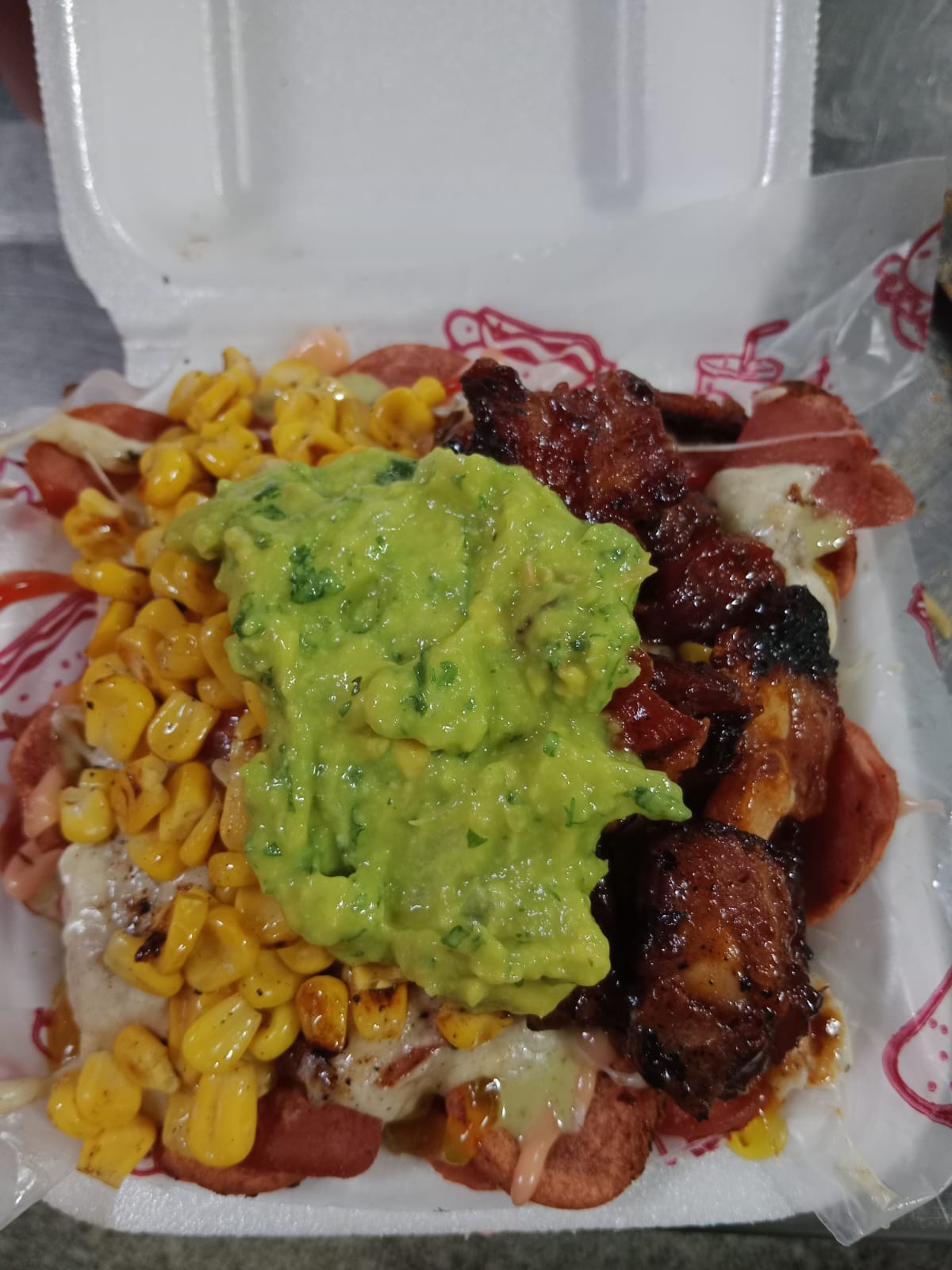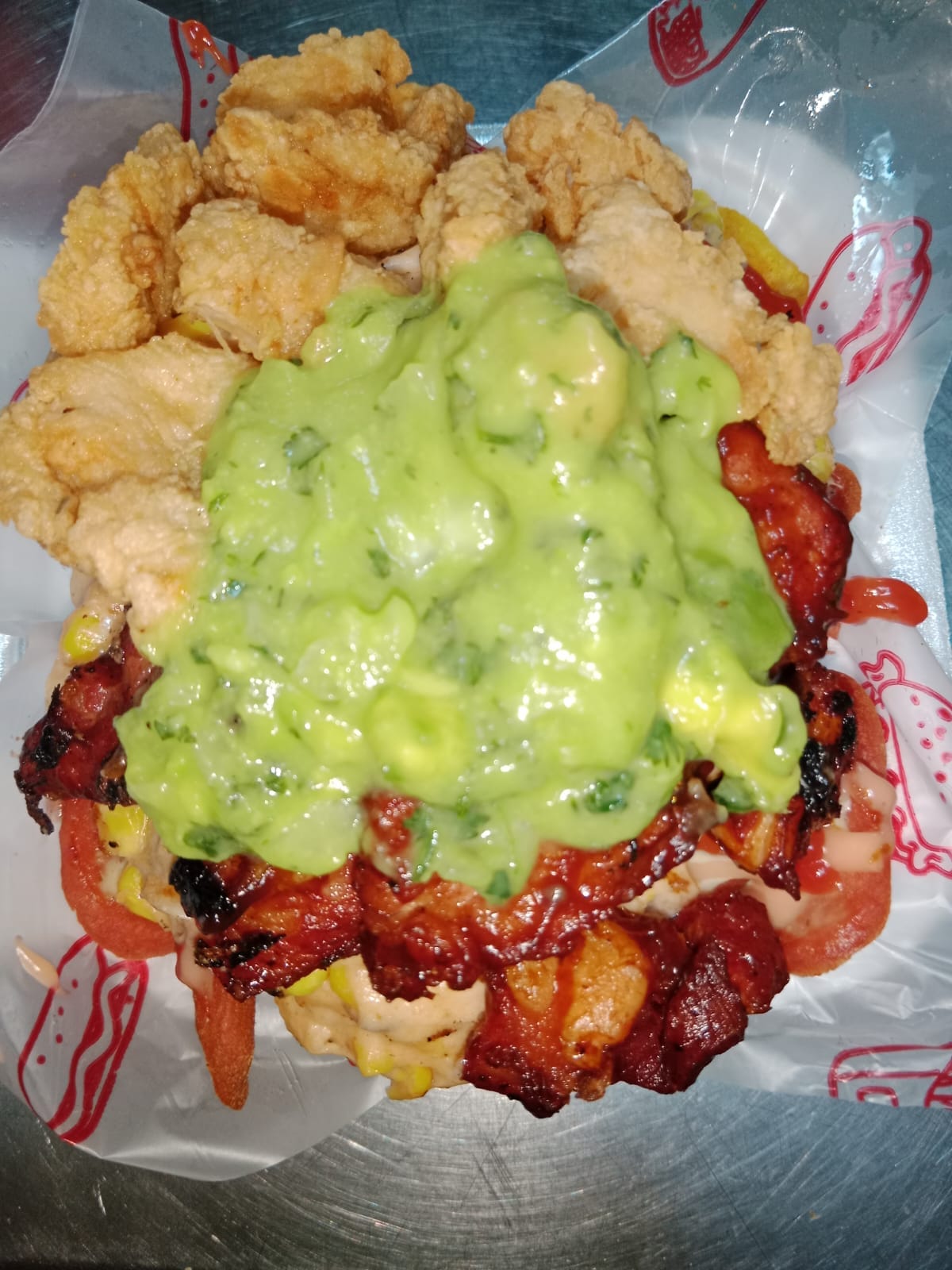 Pollo, res, costilla ahumada, chorizo, tocineta, lechuga, maicitos, queso, ripio, salsas.