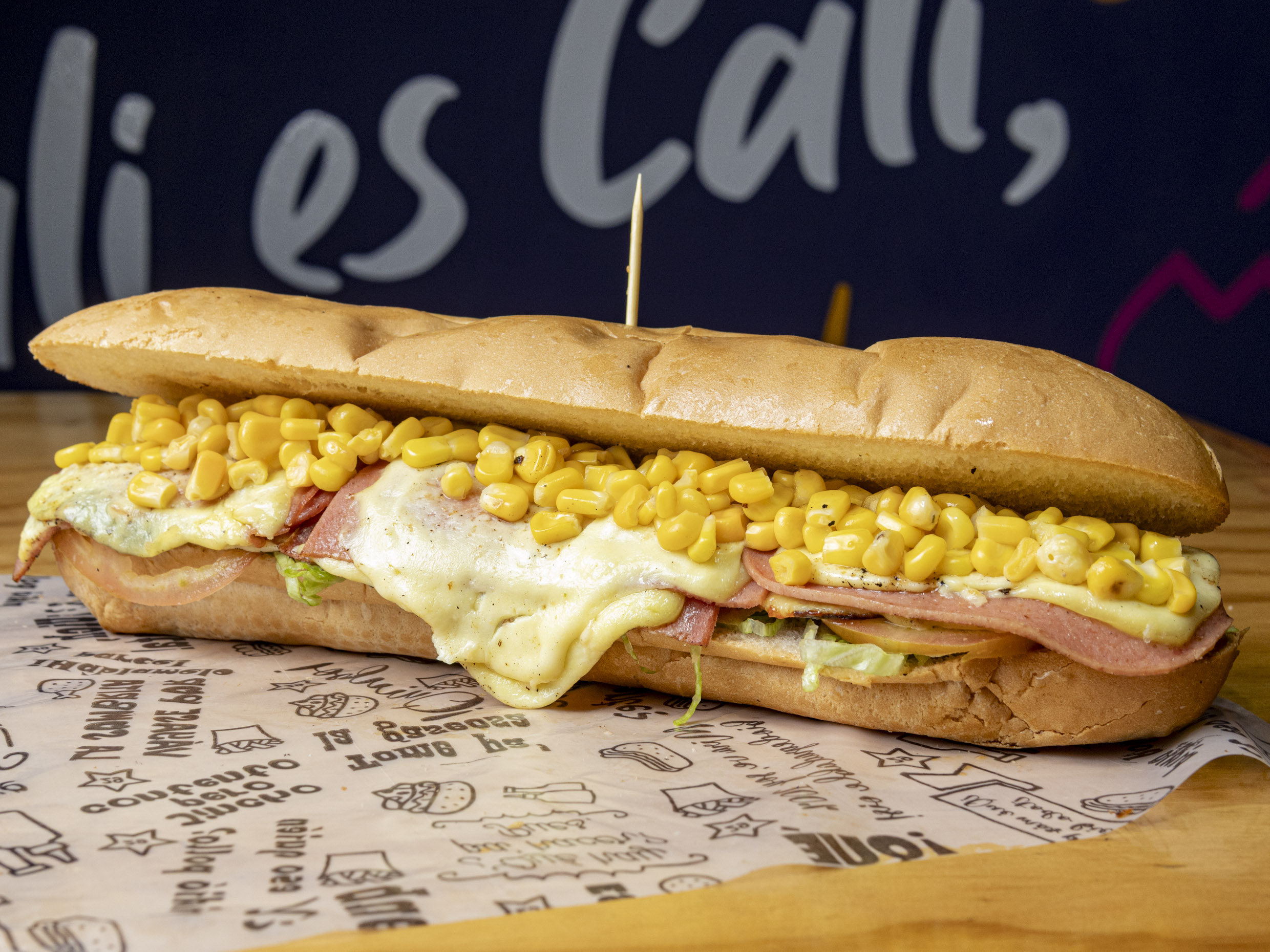 Lechuga, tomate vegetal, queso, salsas, jamón y queso.