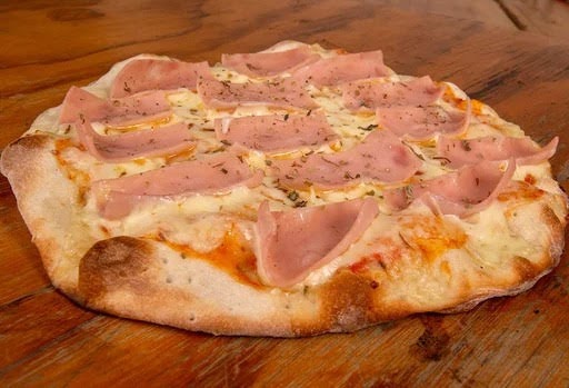 Ingredientes: masa, salsa de la casa, jamón y queso.