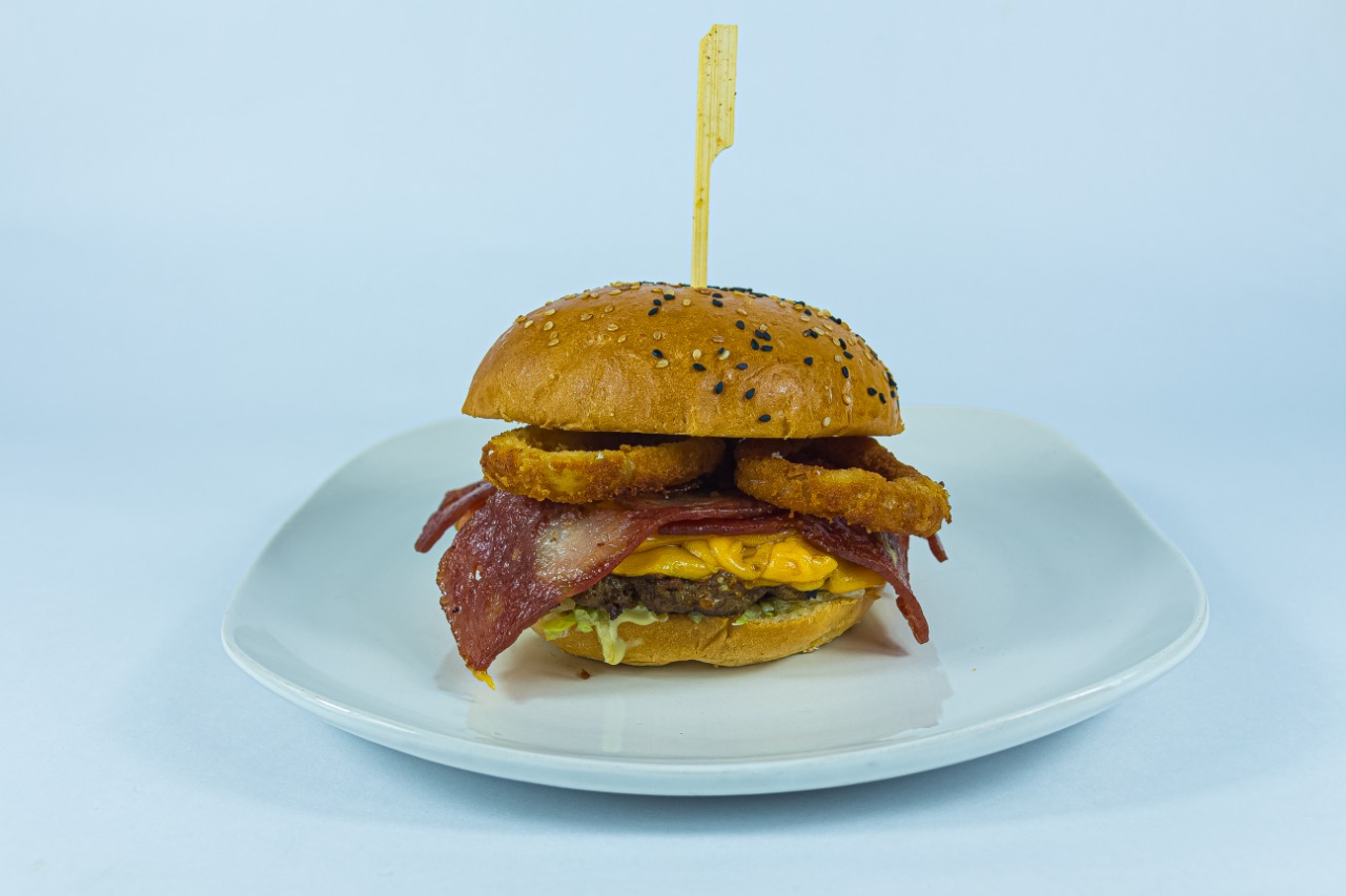 Lechuga, tomate, carne de res casera, jamón, queso, aros de cebolla apanado, tocineta, salsa roja, rosada, casera.