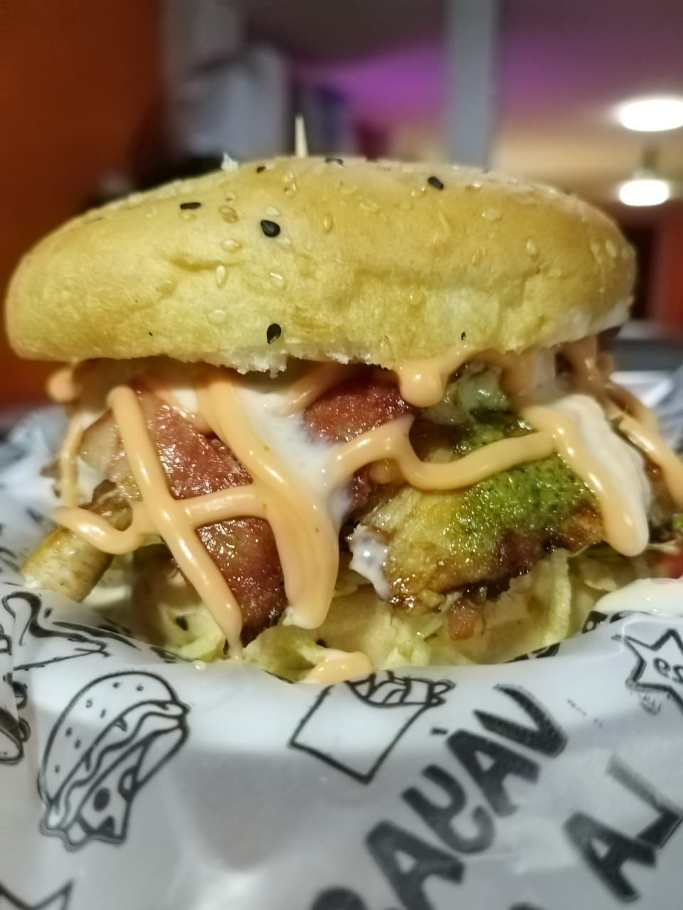 Lechuga, tomate vegetal, queso, salsas, jamón de cordero.