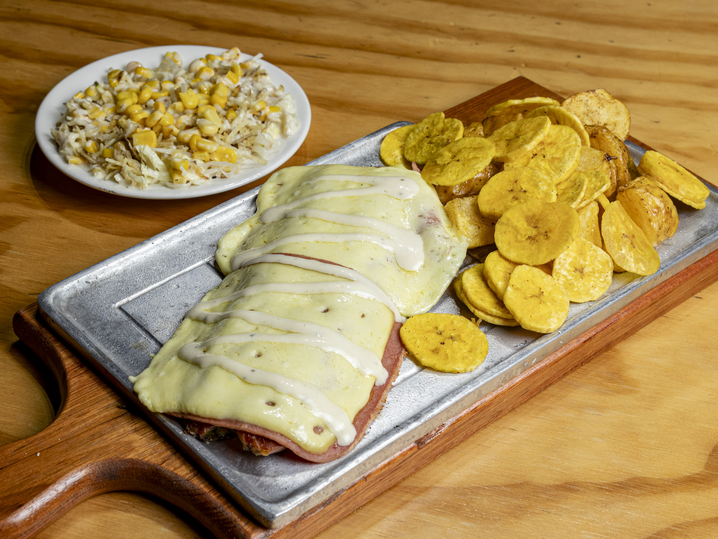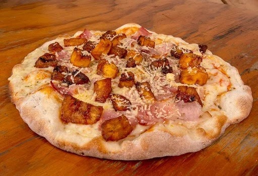 Ingredientes: masa, salsa de la casa, maduro.