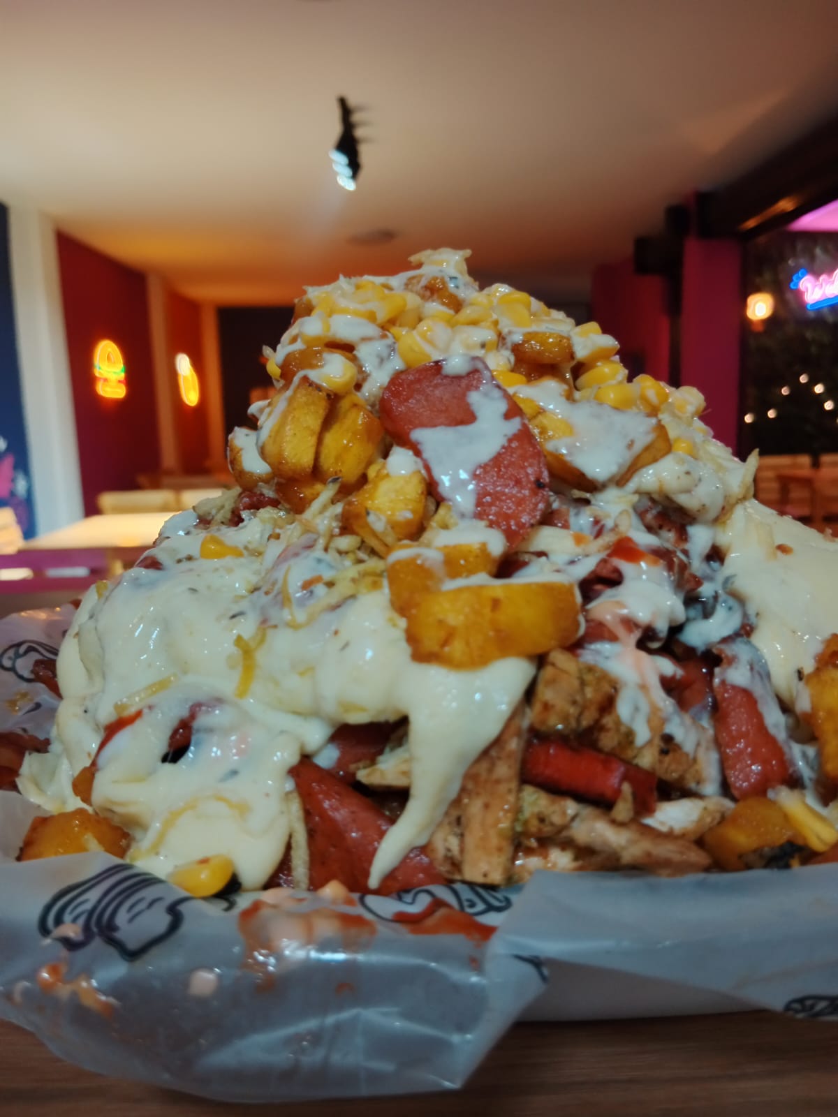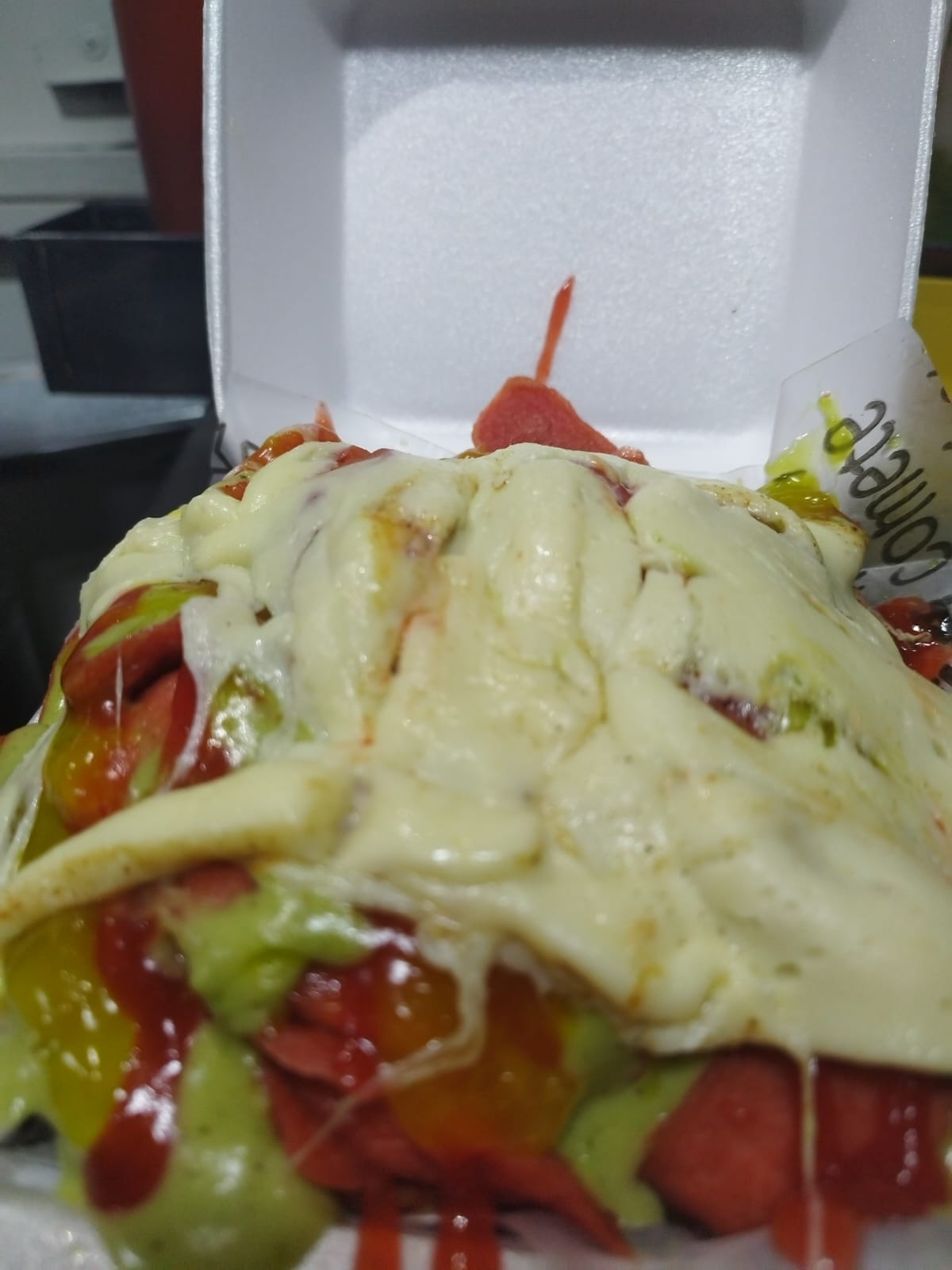 Papa, salchicha, queso y salsas.