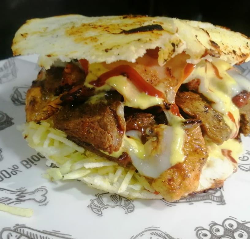 Carne de res, filete de pollo, costilla ahumada, tocineta, aros de cebolla apanado, lechuga, tomate vegetal, salsa rosada, roja, salsa de la casa, queso, jamón.
