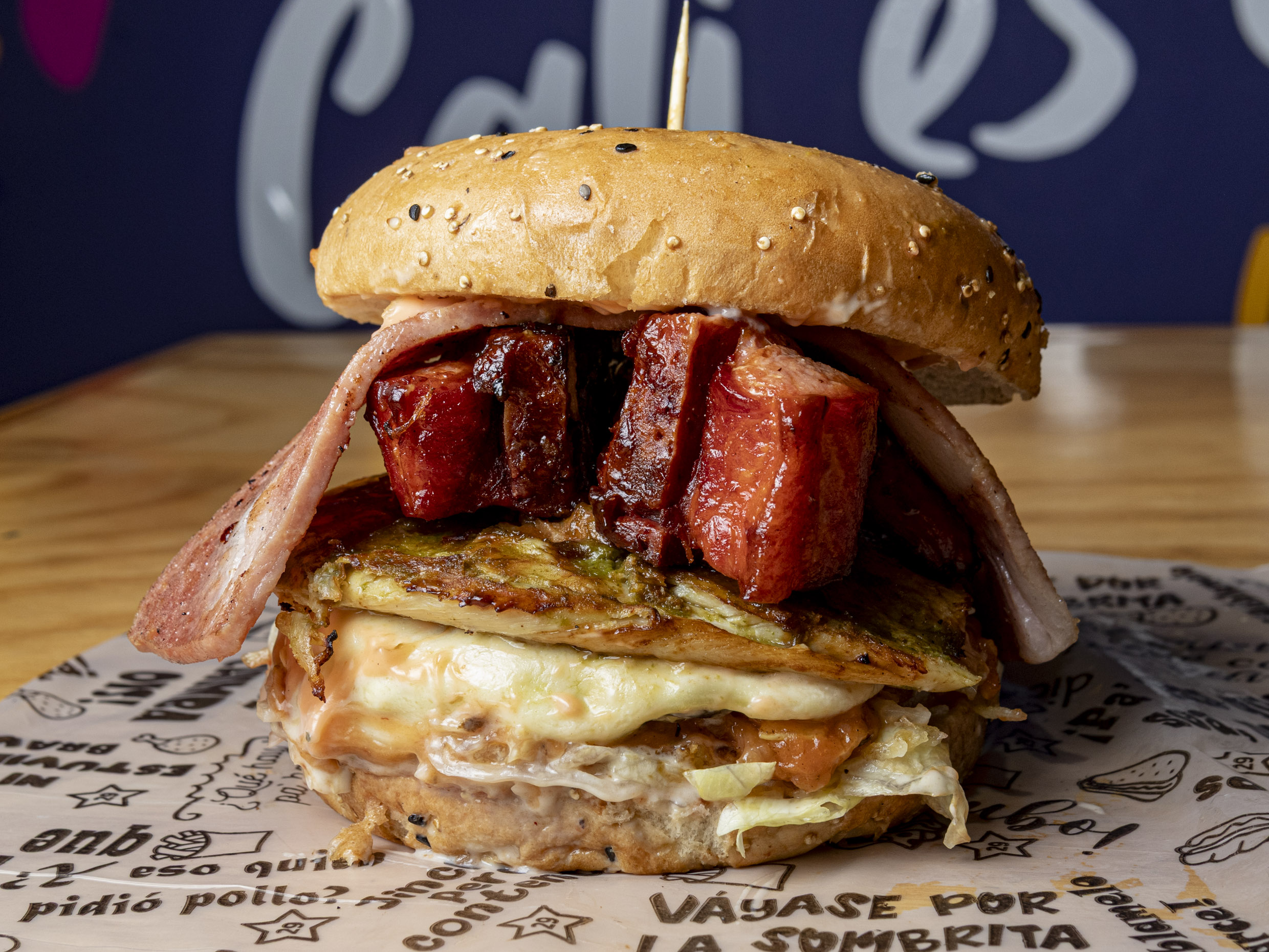 Lechuga, ripio, salsa rosada, salsa de la casa, carne de res, pollo, costilla ahumada, tocineta en trozos, jamón y queso.