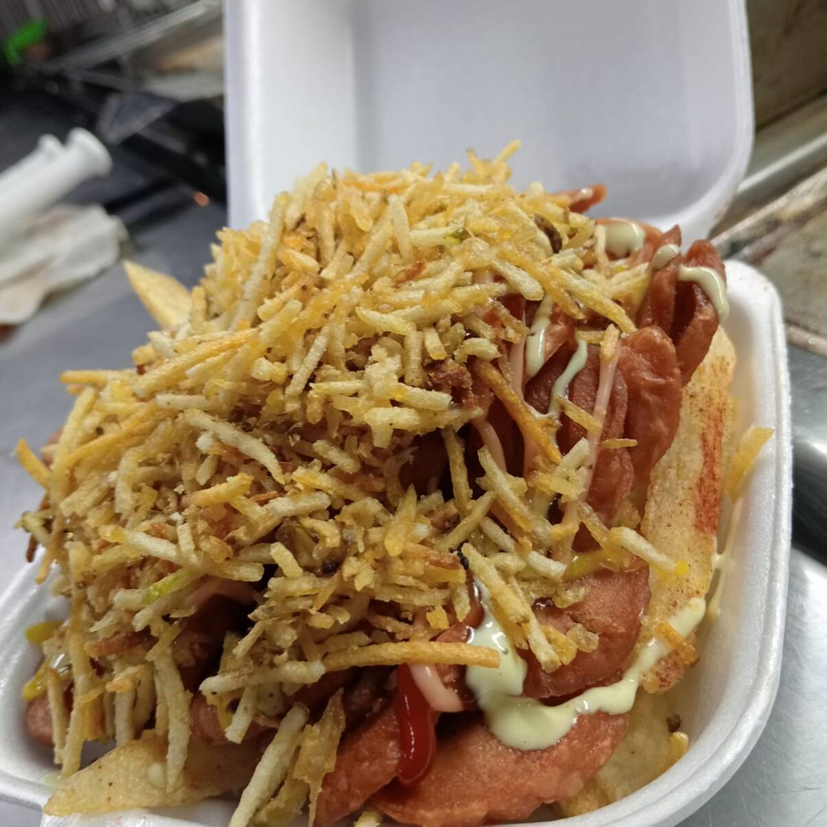 papa a la francesa, salchicha, queso, cebolla caramelizada, salsas,ripio.
