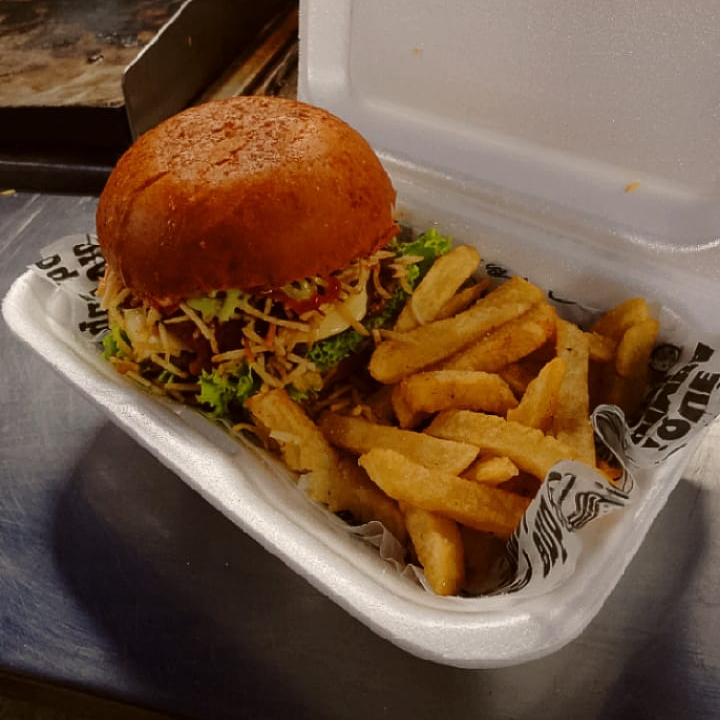 Pan brioche,3 carne artesanal, tocineta,cebolla caramelizada, ripio de papa, salsas.