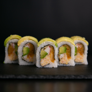 Relleno de queso crema, palmito tempura, pasta dinamita, cebolla larga con topping de aguacate (Uramaki)