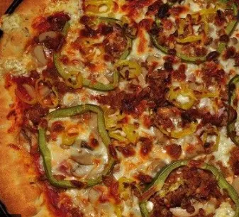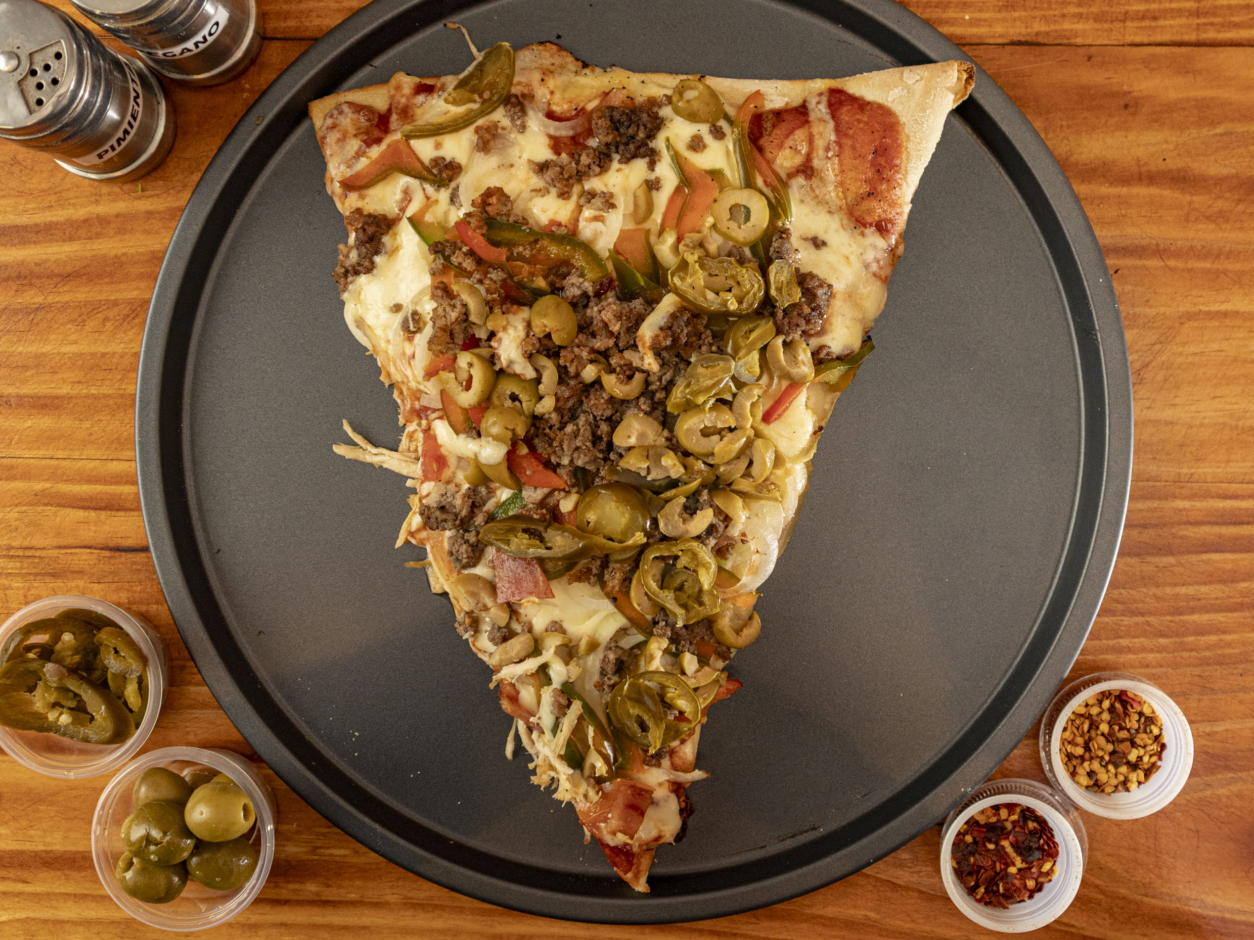 Preparada con pepperoni, pimentón, cebolla, aceitunas, carne molida, jalapeños y queso, 1 porción.