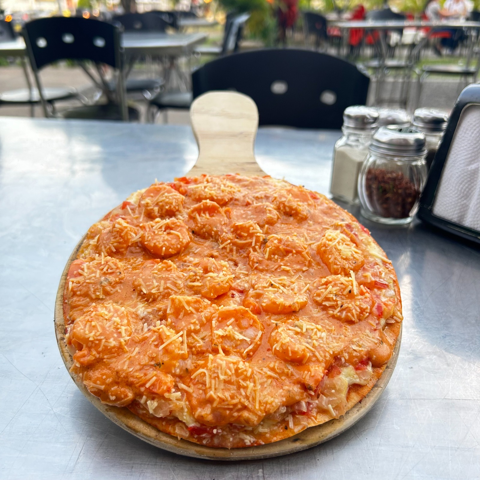 Exquisita pizza con masa crocante con Tomate picado, Camarones, Salsas especiales y Cebollas en Julianas. Personal (4 Porciones)