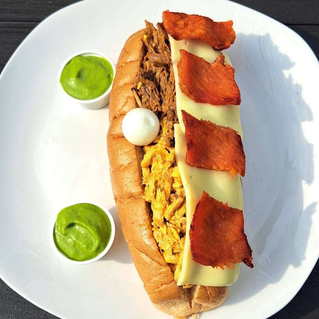 pan de perro lechuga ripio pollo carne queso huevo de codoniz tocineta salsa de la casa y salsa de tomate