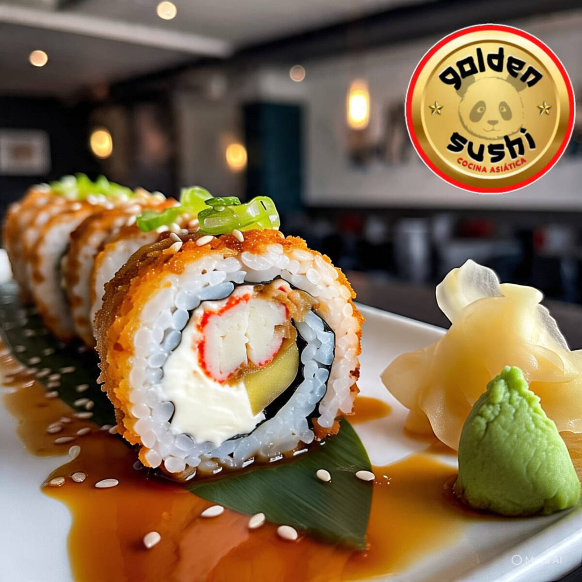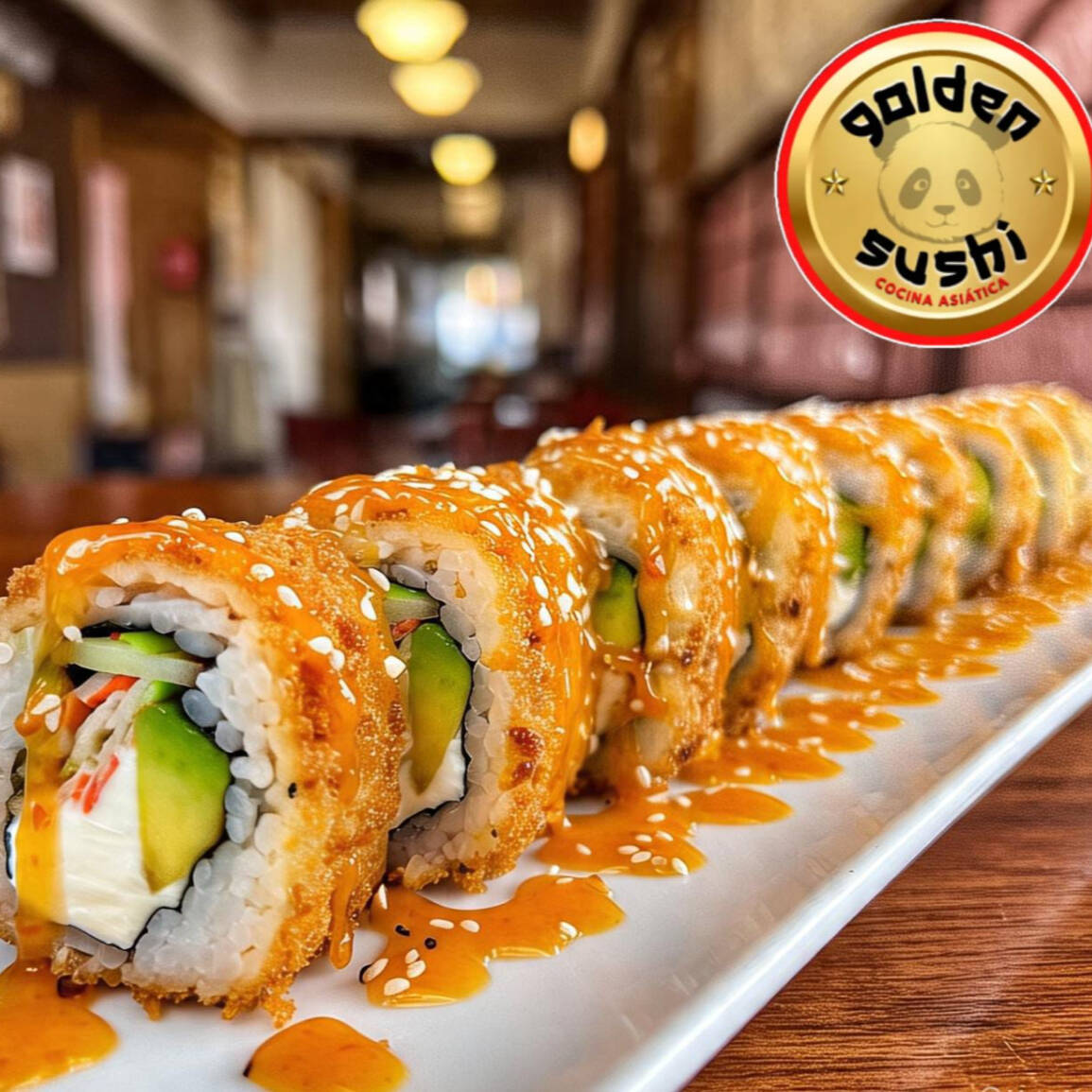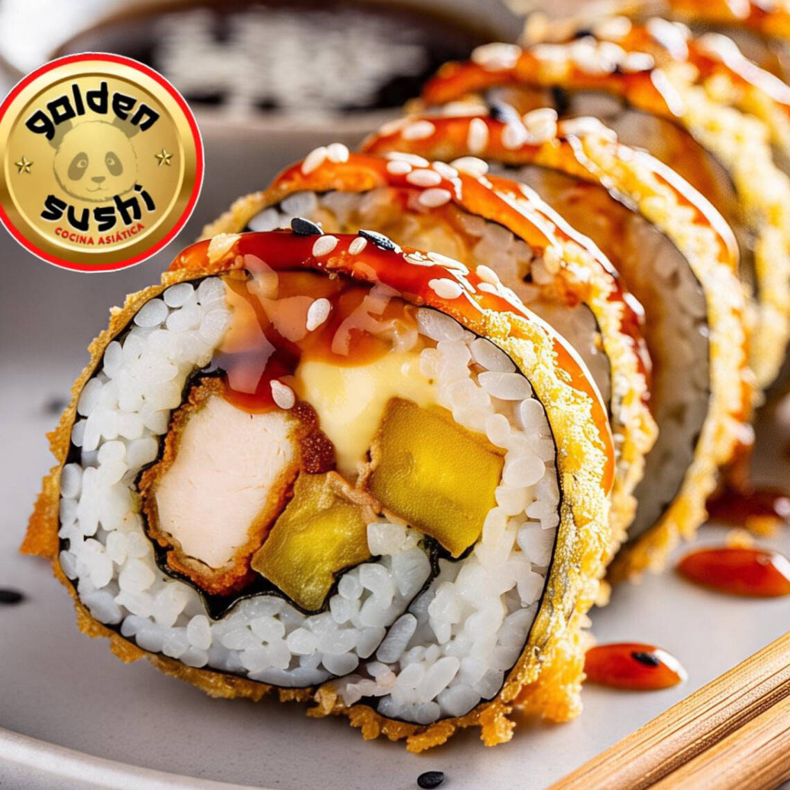 Delicioso rollo de 10 bocados, relleno de pollo tempura,queso crema, maduro y bañado en nuestra deliciosa salsa japonesa (foto solo de referencia).