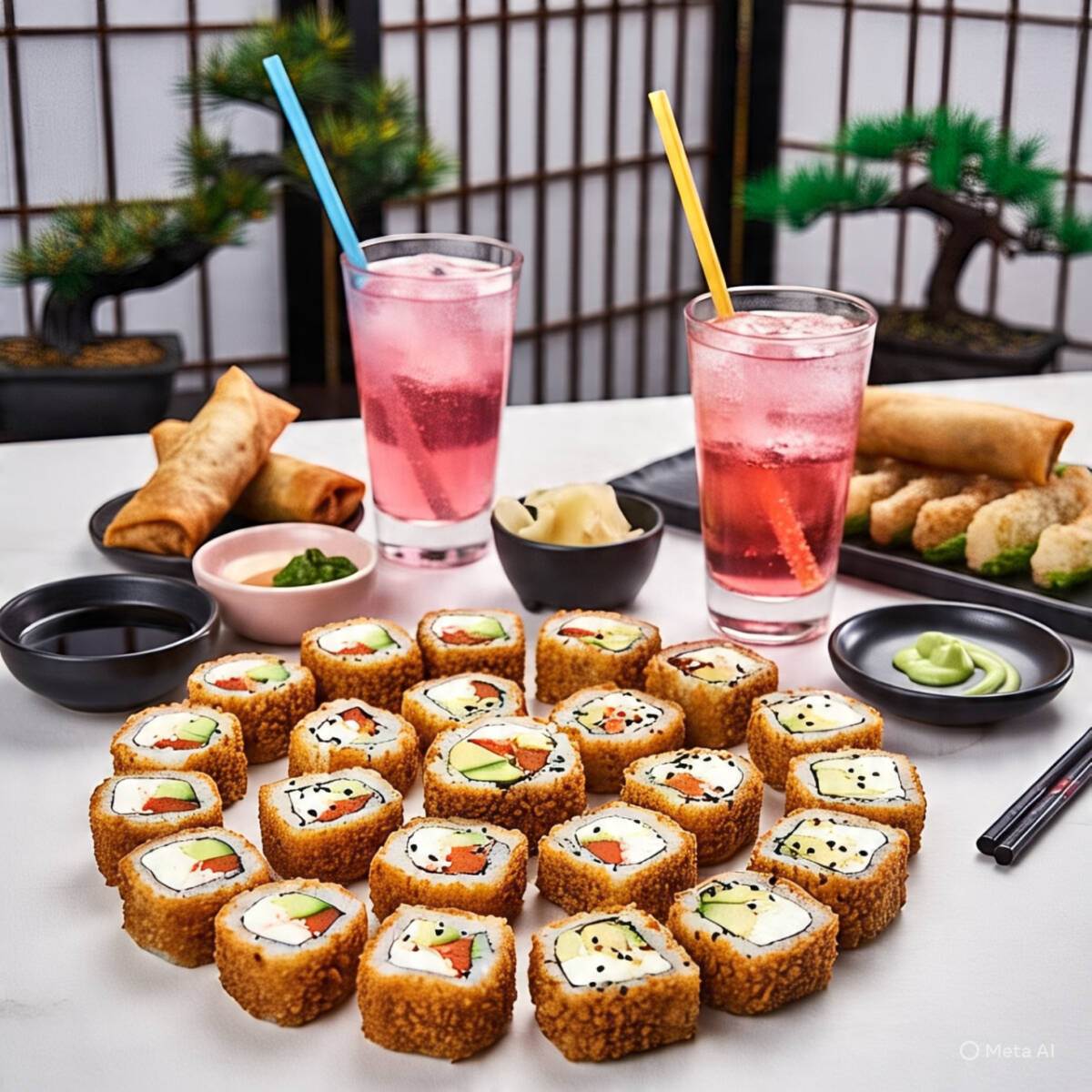 20 bocados de Sushi armados a tu gusto, 2 deliciosas lumpias tradicional, 2 exclusivas Bebidas energéticas sin azúcar (foto solo de referencia).