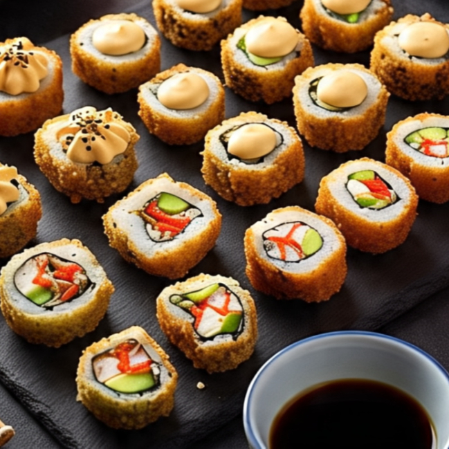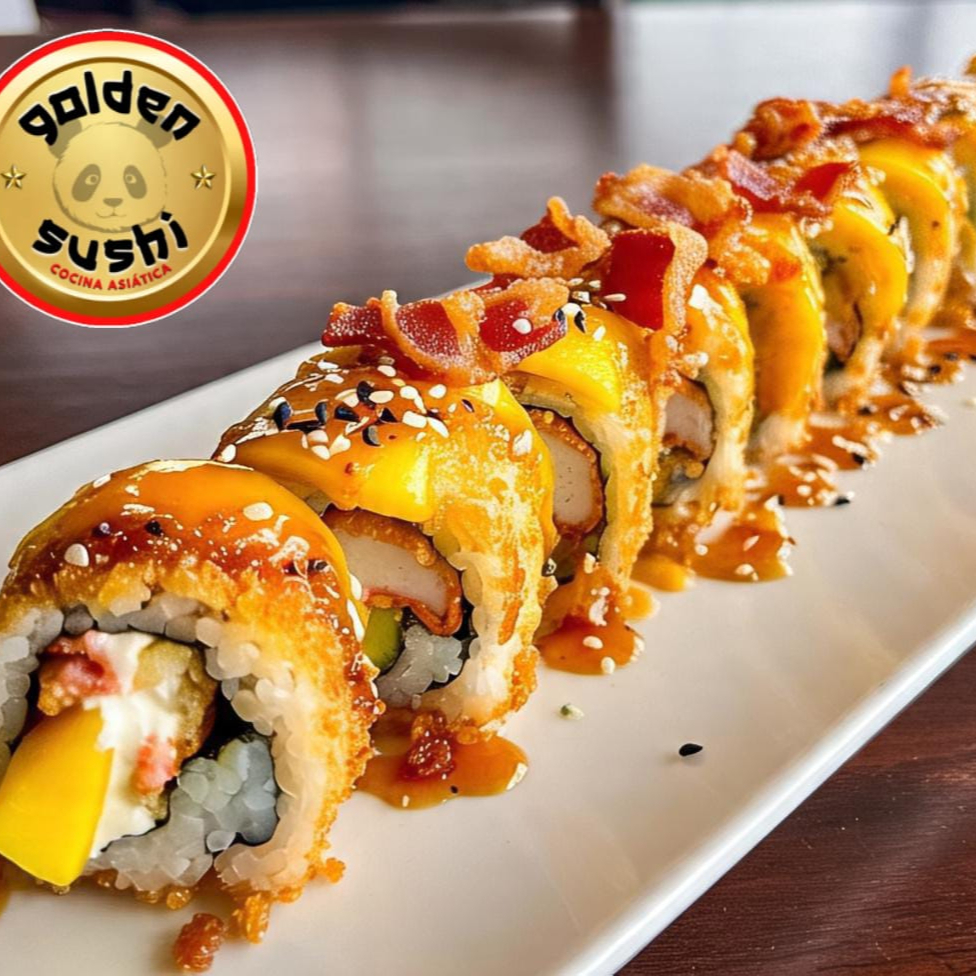 10 bocados para los amantes del sushi, rellenos de queso crema, tocineta ahumada, camarón tempura y mango, bañados en nuestras deliciosas salsas japonesas (foto solo de referencia).