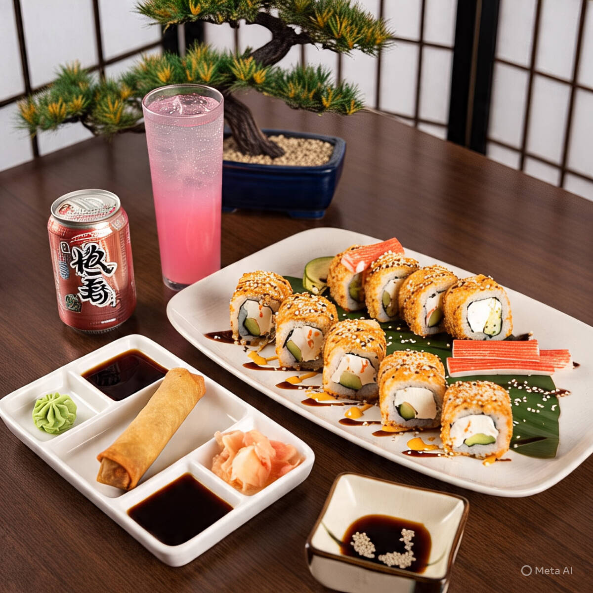 10 bocados de Sushi armados a tu gusto, 1 deliciosa lumpia tradicional, 1 exclusiva Bebida energética sin azúcar (foto solo de referencia).