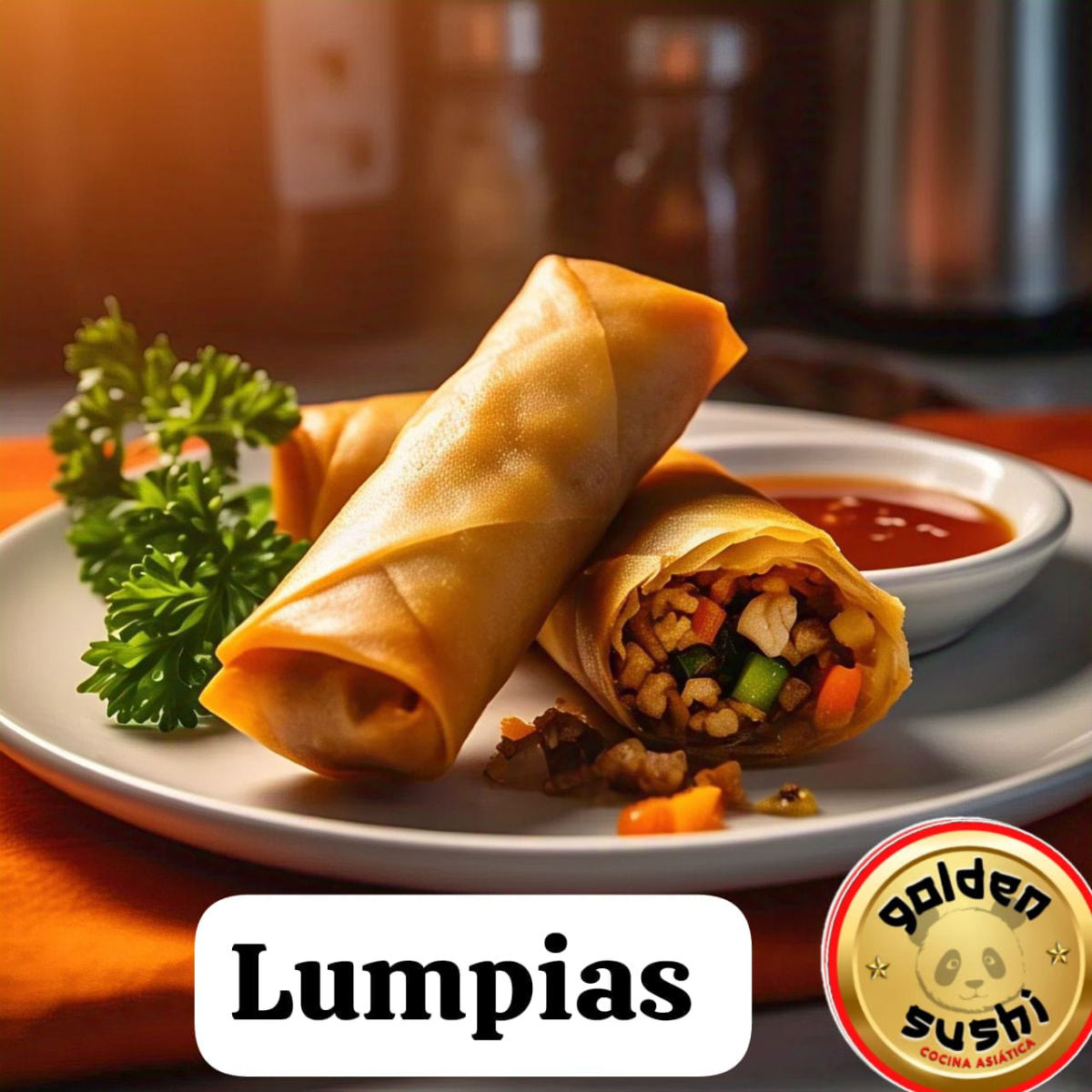2 crocantes típicos asiaticos rellenos de vegetales,pollo picado, jamón y acompañada de salsa agridulce (foto solo de referencia)