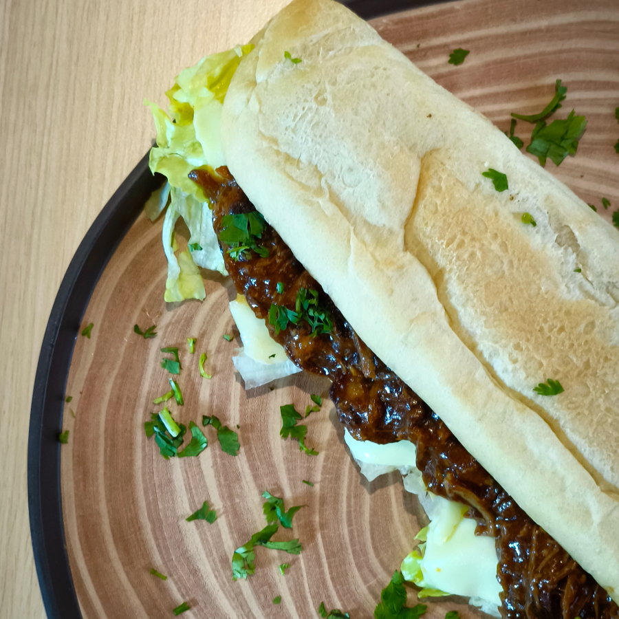 Costilla San Luis en cocción lenta (8 hr de horno), adobado a las finas hierbas 🌿 en nuestra salsa casera BBQ de 4 ingredientes, reducida al vino tinto 🍷, bañado en queso mozarella que se derretirá en tu boca 🫕acompañado de vegetales frescos a tu gusto (lechuga 🥬 y tomate 🍅), dos salsas de la casa 🏡 y pan árabe fresco 🥖