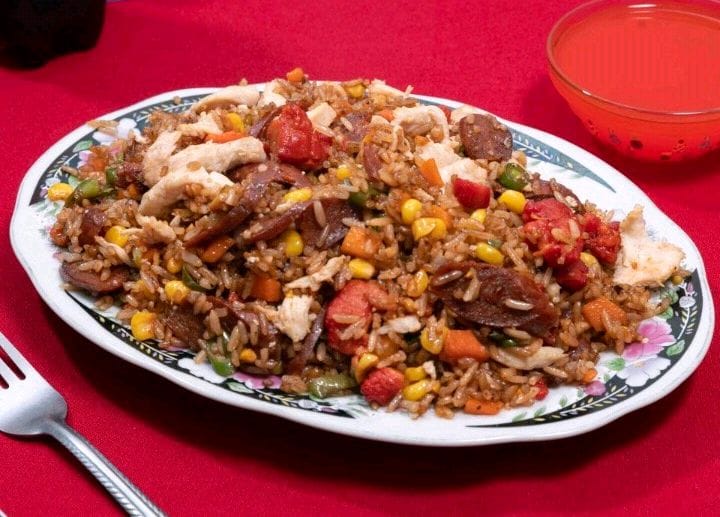 Arroz, pollo, cerdo, jamón, camarón, zanahoria, habichuela, raíz china y 3 presas de pollo apanado.