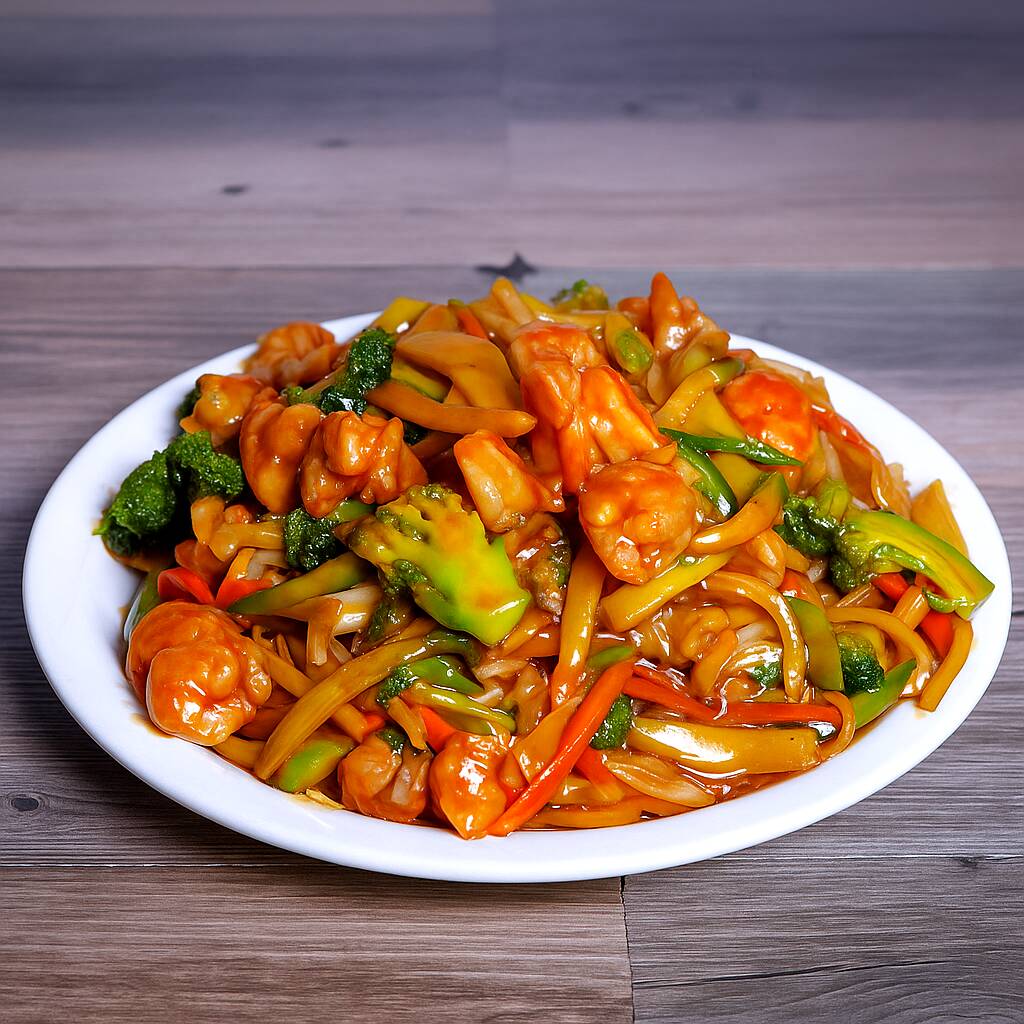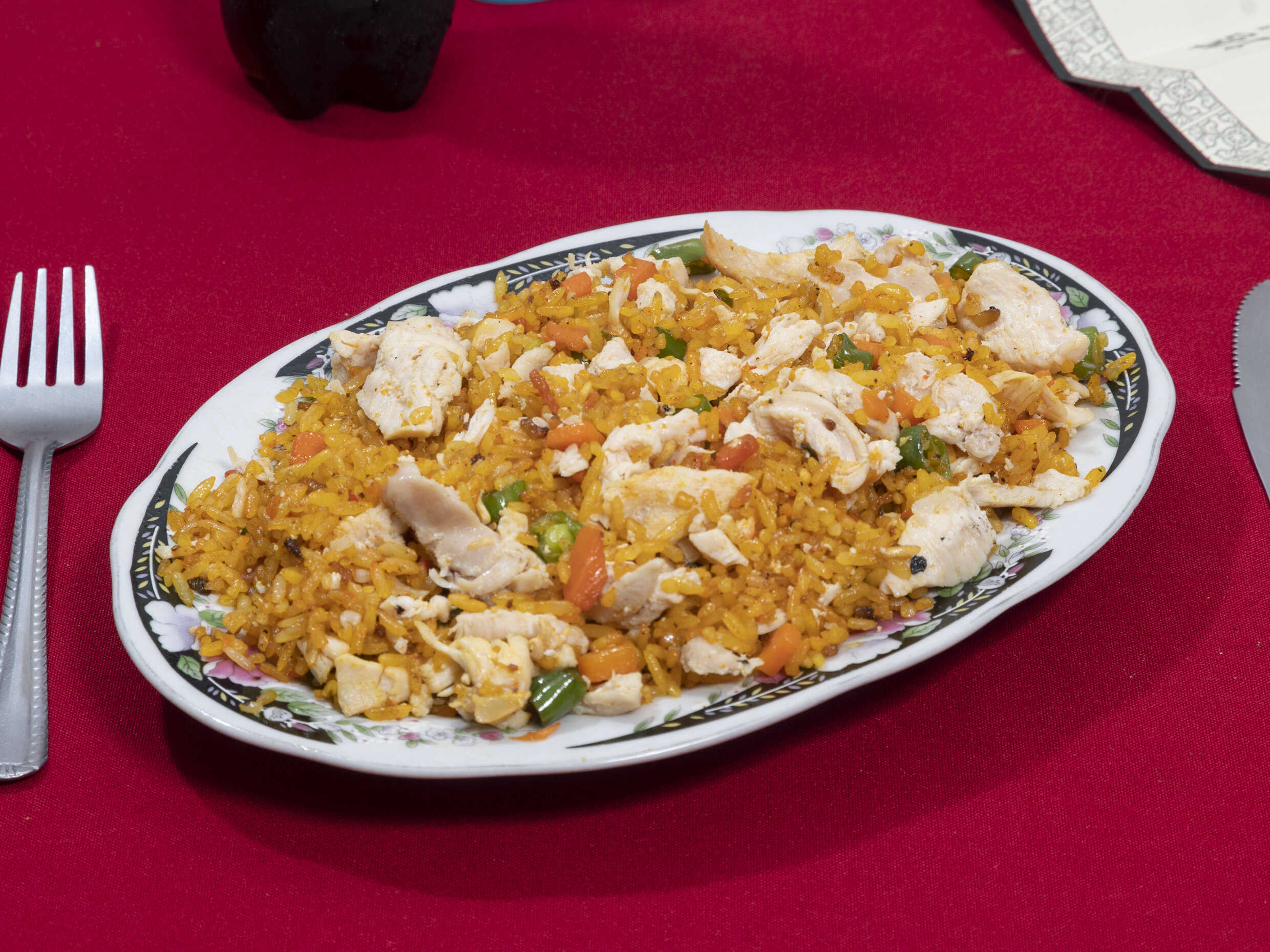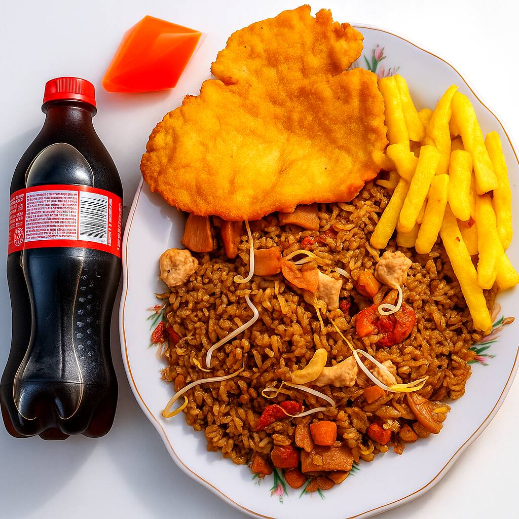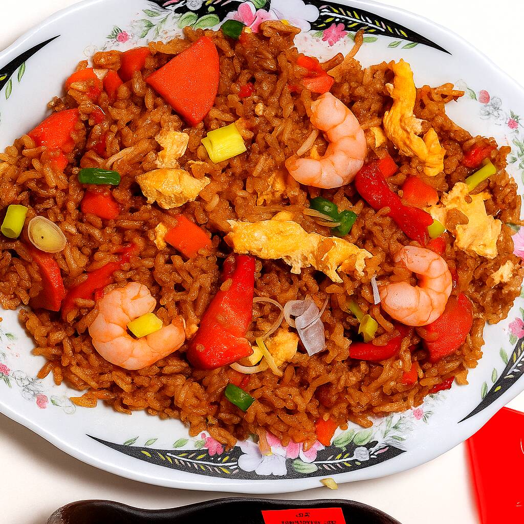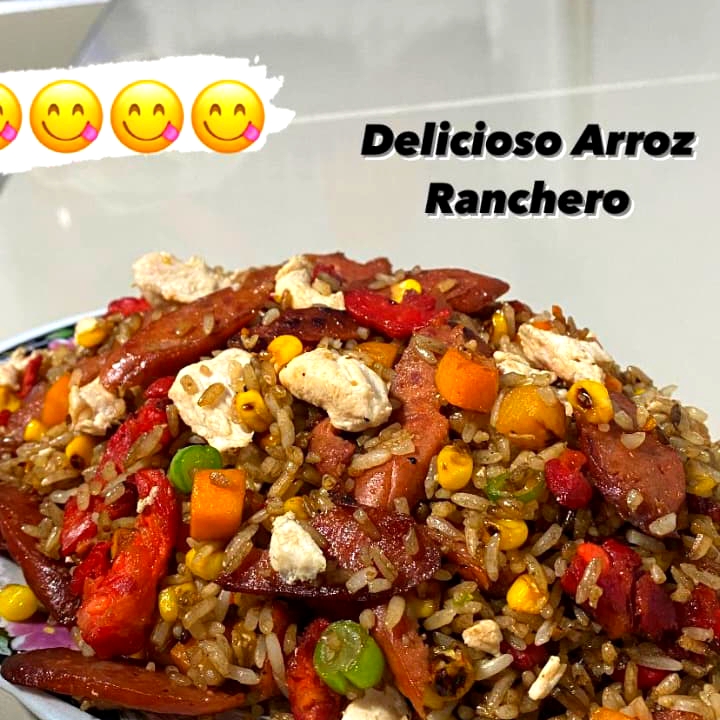 Arroz, pollo, cerdo, jamón, camarón, zanahoria, habichuela, raíz china y medio pollo apanado.