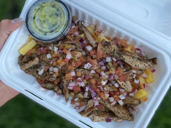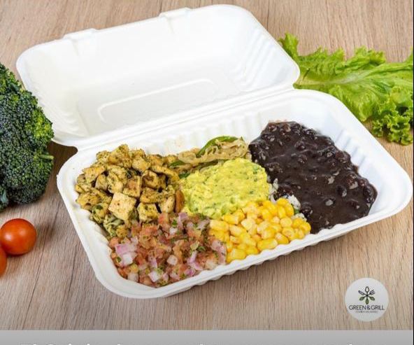 arroz con cilantro, pollo asado a la plancha en finas hiervas, caraotas, pico de gallo, maiz y guacamole