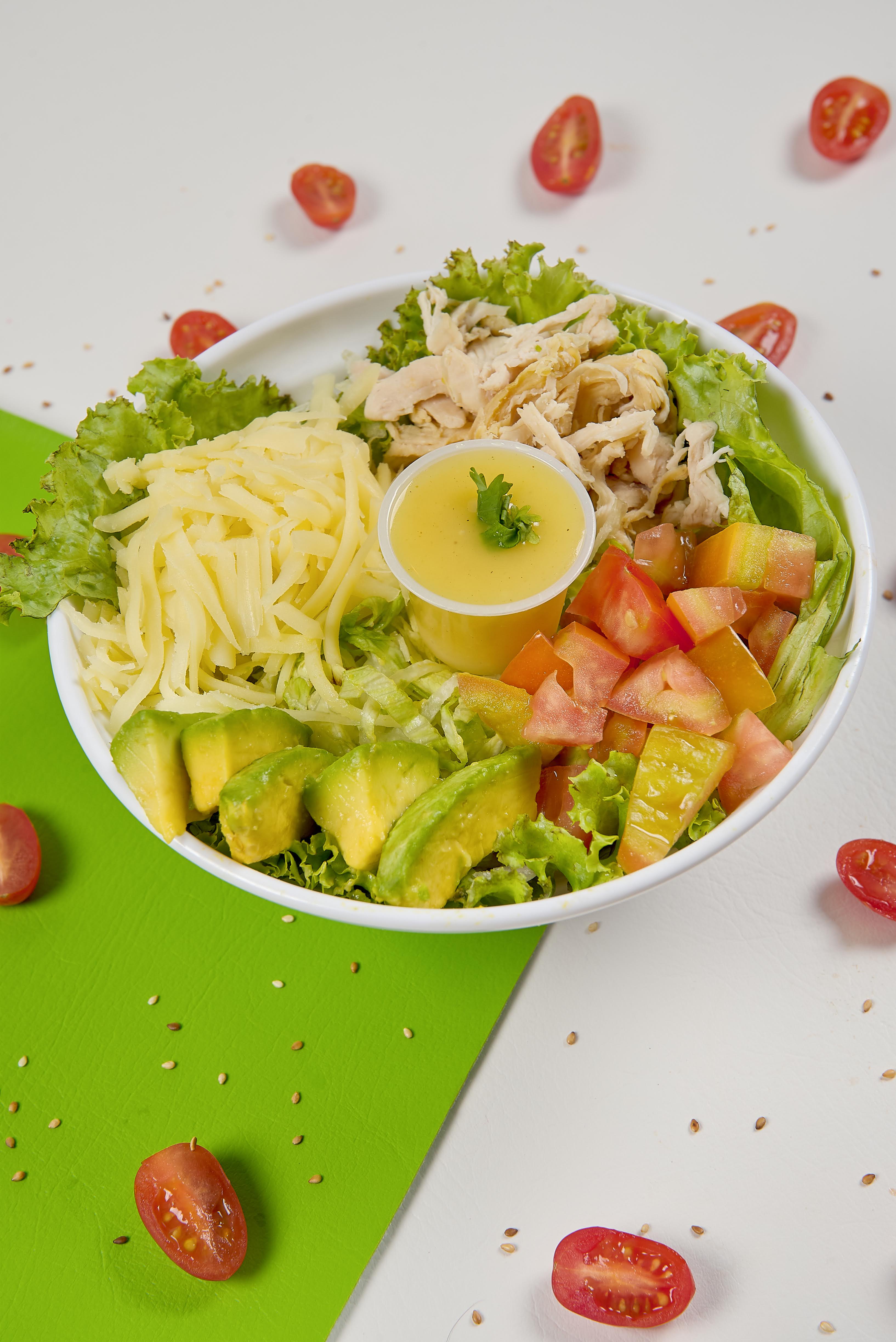 Ensalada con lechuga, pollo, tomate, aguacate y queso.